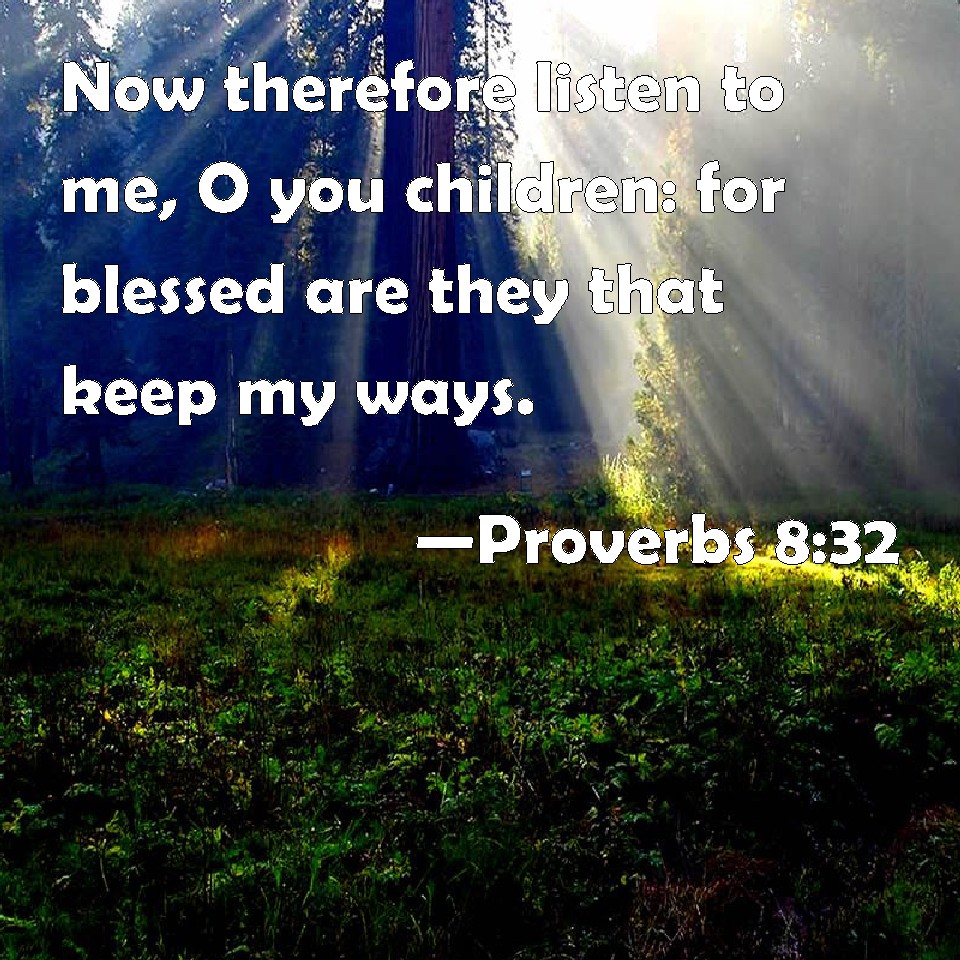 Choose a Background Proverbs 8:32 Now therefore listen to me, O you children: for blessed are they that keep my ways. KJV: Now therefore hearken unto me, O ye children: for blessed are they that keep my ways. DRB: Now therefore, ye children, hear me: Blessed are they that keep my ways. DBT: And now, sons, hearken unto me, and blessed are they that keep my ways: ERV: Now therefore, my sons, hearken unto me: for blessed are they that keep my ways. WBT: Now therefore hearken to me, O ye children: for blessed are they that keep my ways. WEB: "Now therefore, my sons, listen to me, for blessed are those who keep my ways. YLT: And now, ye sons, hearken to me, Yea, happy are they who keep my ways.Links Proverbs 8:32 NIV • Proverbs 8:32 NLT • Proverbs 8:32 ESV • Proverbs 8:32 NASB • Proverbs 8:32 KJV • Proverbs 8:32 Interlinear • Proverbs 8:32 Commentaries • Proverbs 8:32 Parallel Texts • Proverbs 8:32 Bible Apps • Proverbs 8:32 Parallel • Bible Hub |