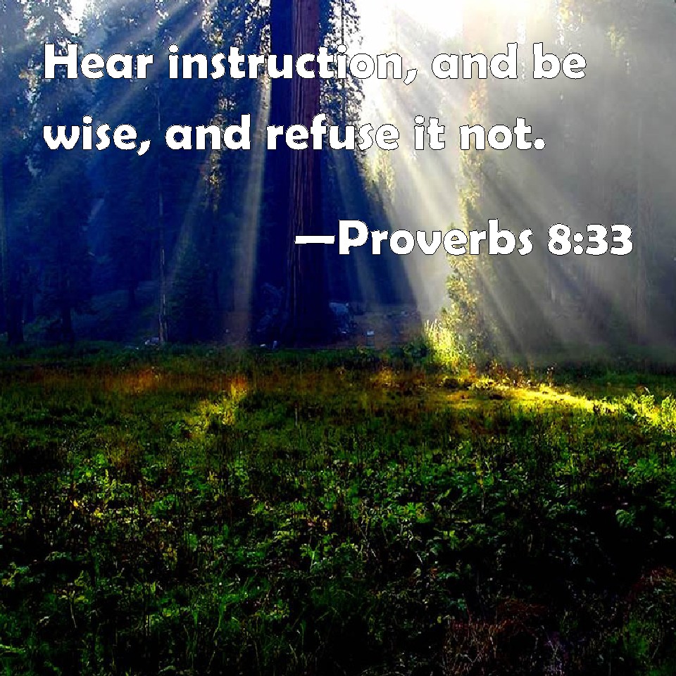 Choose a Background Proverbs 8:33 Hear instruction, and be wise, and refuse it not. KJV: Hear instruction, and be wise, and refuse it not. DRB: Hear instruction and be wise, and refuse it not. DBT: hear instruction and be wise, and refuse it not. ERV: Hear instruction, and be wise, and refuse it not. WBT: Hear instruction, and be wise, and refuse it not. WEB: Hear instruction, and be wise. Don't refuse it. YLT: Hear instruction, and be wise, and slight not.Links Proverbs 8:33 NIV • Proverbs 8:33 NLT • Proverbs 8:33 ESV • Proverbs 8:33 NASB • Proverbs 8:33 KJV • Proverbs 8:33 Interlinear • Proverbs 8:33 Commentaries • Proverbs 8:33 Parallel Texts • Proverbs 8:33 Bible Apps • Proverbs 8:33 Parallel • Bible Hub |