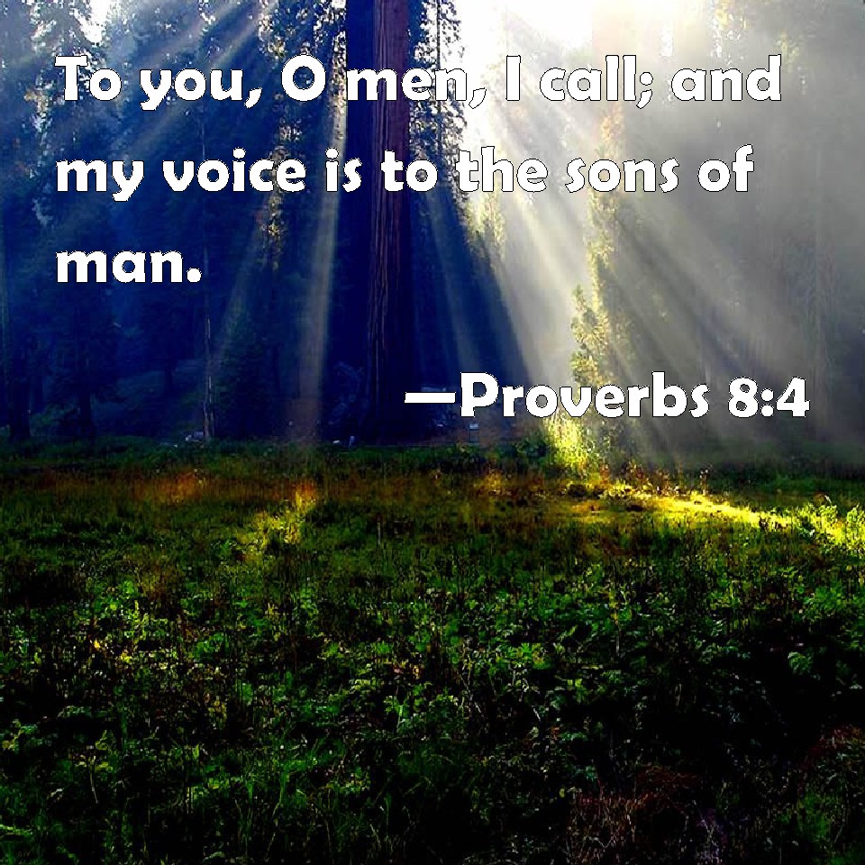 Choose a Background Proverbs 8:4 To you, O men, I call; and my voice is to the sons of man. KJV: Unto you, O men, I call; and my voice is to the sons of man. DRB: O ye men, to you I call, and my voice is to the sons of men. DBT: Unto you, men, I call, and my voice is to the sons of man: ERV: Unto you, O men, I call; and my voice is to the sons of men. WBT: To you, O men, I call; and my voice is to the sons of man. WEB: "To you men, I call! I send my voice to the sons of mankind. YLT: Unto you, O men, I call, And my voice is unto the sons of men.Links Proverbs 8:4 NIV • Proverbs 8:4 NLT • Proverbs 8:4 ESV • Proverbs 8:4 NASB • Proverbs 8:4 KJV • Proverbs 8:4 Interlinear • Proverbs 8:4 Commentaries • Proverbs 8:4 Parallel Texts • Proverbs 8:4 Bible Apps • Proverbs 8:4 Parallel • Bible Hub |