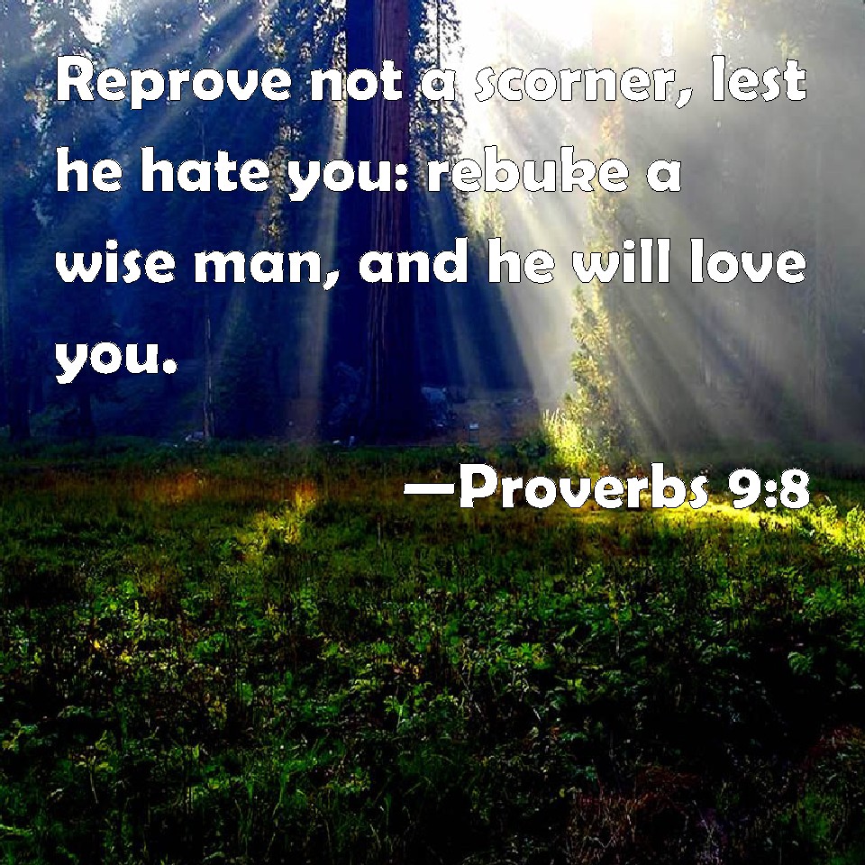 Choose a Background Proverbs 9:8 Reprove not a scorner, lest he hate you: rebuke a wise man, and he will love you. KJV: Reprove not a scorner, lest he hate thee: rebuke a wise man, and he will love thee. DRB: Rebuke not a scorner lest he hate thee. Rebuke a wise man, and he will love thee. DBT: Reprove not a scorner, lest he hate thee; reprove a wise man, and he will love thee. ERV: Reprove not a scorner, lest he hate thee: reprove a wise man, and he will love thee. WBT: Reprove not a scorner, lest he shall hate thee: rebuke a wise man, and he will love thee. WEB: Don't reprove a scoffer, lest he hate you. Reprove a wise man, and he will love you. YLT: Reprove not a scorner, lest he hate thee, Give reproof to the wise, and he loveth thee.Links Proverbs 9:8 NIV • Proverbs 9:8 NLT • Proverbs 9:8 ESV • Proverbs 9:8 NASB • Proverbs 9:8 KJV • Proverbs 9:8 Interlinear • Proverbs 9:8 Commentaries • Proverbs 9:8 Parallel Texts • Proverbs 9:8 Bible Apps • Proverbs 9:8 Parallel • Bible Hub |