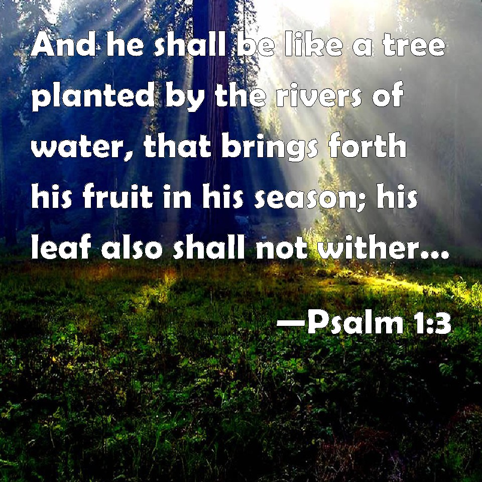 Choose a Background Psalm 1:3 And he shall be like a tree planted by the rivers of water, that brings forth his fruit in his season; his leaf also shall not wither; and whatever he does shall prosper. KJV: And he shall be like a tree planted by the rivers of water, that bringeth forth his fruit in his season; his leaf also shall not wither; and whatsoever he doeth shall prosper. DRB: And he shall be like a tree which is planted near the running waters, which shall bring forth its fruit, in due season. And his leaf shall not fall off: and all whosoever he shall do shall prosper. DBT: And he is as a tree planted by brooks of water, which giveth its fruit in its season, and whose leaf fadeth not; and all that he doeth prospereth. ERV: And he shall be like a tree planted by the streams of water, that bringeth forth its fruit in its season, whose leaf also doth not wither; and whatsoever he doeth shall prosper. WBT: And he shall be like a tree planted by the rivers of water, that bringeth forth its fruit in season; its leaf also shall not wither; and whatever he doeth shall prosper. WEB: He will be like a tree planted by the streams of water, that brings forth its fruit in its season, whose leaf also does not wither. Whatever he does shall prosper. YLT: And he hath been as a tree, Planted by rivulets of water, That giveth its fruit in its season, And its leaf doth not wither, And all that he doth he causeth to prosper.Links Psalm 1:3 NIV • Psalm 1:3 NLT • Psalm 1:3 ESV • Psalm 1:3 NASB • Psalm 1:3 KJV • Psalm 1:3 Interlinear • Psalm 1:3 Commentaries • Psalm 1:3 Parallel Texts • Psalm 1:3 Bible Apps • Psalm 1:3 Parallel • Bible Hub |