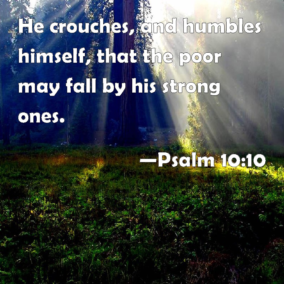 Choose a Background Psalm 10:10 He crouches, and humbles himself, that the poor may fall by his strong ones. KJV: He croucheth, and humbleth himself, that the poor may fall by his strong ones. DRB: In his net he will bring him down, he will crouch and fall, when he shall have power over the poor. DBT: He croucheth, he boweth down, that the wretched may fall by his strong ones. ERV: He croucheth, he boweth down, and the helpless fall by his strong ones. WBT: He croucheth, and humbleth himself, that the poor may fall by his strong ones. WEB: The helpless are crushed. They collapse. They fall under his strength. YLT: He is bruised — he boweth down, Fallen by his mighty ones hath the afflicted.Links Psalm 10:10 NIV • Psalm 10:10 NLT • Psalm 10:10 ESV • Psalm 10:10 NASB • Psalm 10:10 KJV • Psalm 10:10 Interlinear • Psalm 10:10 Commentaries • Psalm 10:10 Parallel Texts • Psalm 10:10 Bible Apps • Psalm 10:10 Parallel • Bible Hub |