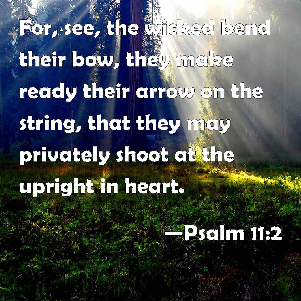 Choose a Background Psalm 11:2 For, see, the wicked bend their bow, they make ready their arrow on the string, that they may privately shoot at the upright in heart. KJV: For, lo, the wicked bend their bow, they make ready their arrow upon the string, that they may privily shoot at the upright in heart. DRB: For, lo, the wicked have bent their bow; they have prepared their arrows in the quiver; to shoot in the dark the upright of heart. DBT: For behold, the wicked bend the bow, they make ready their arrow upon the string, that they may in darkness shoot at the upright in heart. ERV: For, lo, the wicked bend the bow, they make ready their arrow upon the string, that they may shoot in darkness at the upright in heart. WBT: For lo, the wicked bend their bow, they make ready their arrow upon the string, that they may privily shoot at the upright in heart. WEB: For, behold, the wicked bend their bows. They set their arrows on the strings, that they may shoot in darkness at the upright in heart. YLT: For lo, the wicked tread a bow, They have prepared their arrow on the string, To shoot in darkness at the upright in heart.Links Psalm 11:2 NIV • Psalm 11:2 NLT • Psalm 11:2 ESV • Psalm 11:2 NASB • Psalm 11:2 KJV • Psalm 11:2 Interlinear • Psalm 11:2 Commentaries • Psalm 11:2 Parallel Texts • Psalm 11:2 Bible Apps • Psalm 11:2 Parallel • Bible Hub |