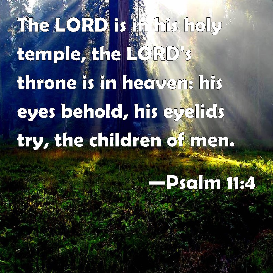 Choose a Background Psalm 11:4 The LORD is in his holy temple, the LORD's throne is in heaven: his eyes behold, his eyelids try, the children of men. KJV: The LORD is in his holy temple, the LORD'S throne is in heaven: his eyes behold, his eyelids try, the children of men. DRB: The Lord is in his holy temple, the Lord's throne is in heaven. His eyes look on the poor man: his eyelids examine the sons of men. DBT: Jehovah is in the temple of his holiness; Jehovah, his throne is in the heavens: his eyes behold, his eyelids try the children of men. ERV: The LORD is in his holy temple, the LORD, his throne is in heaven; his eyes behold, his eyelids try, the children of men. WBT: The LORD is in his holy temple, the LORD'S throne is in heaven: his eyes behold, his eyelids try the children of men. WEB: Yahweh is in his holy temple. Yahweh is on his throne in heaven. His eyes observe. His eyes examine the children of men. YLT: Jehovah is in his holy temple: Jehovah — in the heavens is His throne. His eyes see — His eyelids try the sons of men.Links Psalm 11:4 NIV • Psalm 11:4 NLT • Psalm 11:4 ESV • Psalm 11:4 NASB • Psalm 11:4 KJV • Psalm 11:4 Interlinear • Psalm 11:4 Commentaries • Psalm 11:4 Parallel Texts • Psalm 11:4 Bible Apps • Psalm 11:4 Parallel • Bible Hub |