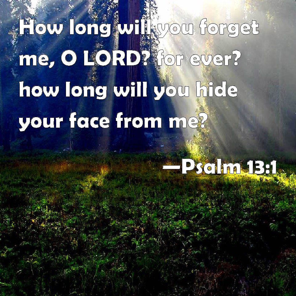 Choose a Background Psalm 13:1 How long will you forget me, O LORD? for ever? how long will you hide your face from me? KJV: {To the chief Musician, A Psalm of David.} How long wilt thou forget me, O LORD? for ever? how long wilt thou hide thy face from me? DRB: Unto the end, a psalm for David. How long, O Lord, wilt thou forget me unto the end? how long dost thou turn away thy face from me? DBT: {To the chief Musician. A Psalm of David.} How long, Jehovah, wilt thou forget me for ever? how long wilt thou hide thy face from me? ERV: For the Chief Musician. A Psalm of David. How long, O LORD, wilt thou forget me for ever? how long wilt thou hide thy face from me? WBT: To the chief Musician, A Psalm of David. How long wilt thou forget me, O LORD? for ever? how long wilt thou hide thy face from me? WEB: How long, Yahweh? Will you forget me forever? How long will you hide your face from me? YLT: To the Overseer. — A Psalm of David. Till when, O Jehovah, Dost Thou forget me? — for ever? Till when dost Thou hide Thy face from me?Links Psalm 13:1 NIV • Psalm 13:1 NLT • Psalm 13:1 ESV • Psalm 13:1 NASB • Psalm 13:1 KJV • Psalm 13:1 Interlinear • Psalm 13:1 Commentaries • Psalm 13:1 Parallel Texts • Psalm 13:1 Bible Apps • Psalm 13:1 Parallel • Bible Hub |