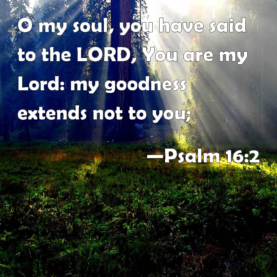 Choose a Background Psalm 16:2 O my soul, you have said to the LORD, You are my Lord: my goodness extends not to you; KJV: O my soul, thou hast said unto the LORD, Thou art my Lord: my goodness extendeth not to thee; DRB: I have said to the Lord, thou art my God, for thou hast no need of my goods. DBT: Thou my soul hast said to Jehovah, Thou art the Lord: my goodness extendeth not to thee; — ERV: I have said unto the LORD, Thou art my Lord: I have no good beyond thee. WBT: O my soul, thou hast said to the LORD, Thou art my Lord: my goodness extendeth not to thee; WEB: My soul, you have said to Yahweh, "You are my Lord. Apart from you I have no good thing." YLT: Thou hast said to Jehovah, 'My Lord Thou art;' My good is not for thine own sake;Links Psalm 16:2 NIV • Psalm 16:2 NLT • Psalm 16:2 ESV • Psalm 16:2 NASB • Psalm 16:2 KJV • Psalm 16:2 Interlinear • Psalm 16:2 Commentaries • Psalm 16:2 Parallel Texts • Psalm 16:2 Bible Apps • Psalm 16:2 Parallel • Bible Hub |