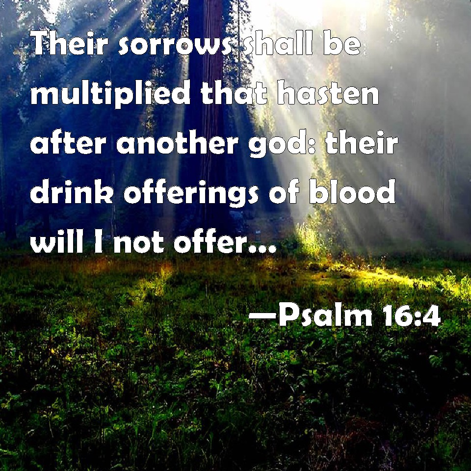 Psalm 16:4 Their sorrows shall be multiplied that hasten after another god: their drink offerings of blood will I not offer, nor take up their names into my lips.