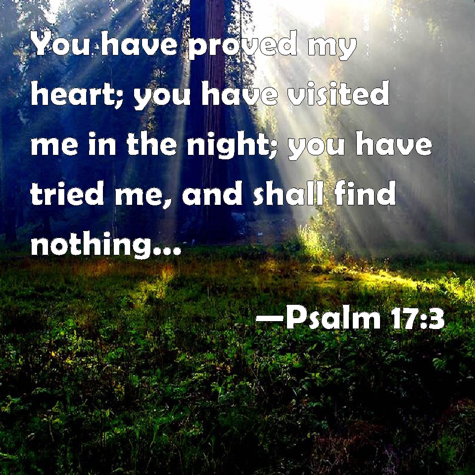 Choose a Background Psalm 17:3 You have proved my heart; you have visited me in the night; you have tried me, and shall find nothing; I am purposed that my mouth shall not transgress. KJV: Thou hast proved mine heart; thou hast visited me in the night; thou hast tried me, and shalt find nothing; I am purposed that my mouth shall not transgress. DRB: Thou hast proved my heart, and visited it by night, thou hast tried me by fire: and iniquity hath not been found in me. DBT: Thou hast proved my heart, thou hast visited me by night; thou hast tried me, thou hast found nothing: my thought goeth not beyond my word. ERV: Thou hast proved mine heart; thou hast visited me in the night; thou hast tried me, and findest nothing; I am purposed that my mouth shall not transgress. WBT: Thou hast proved my heart; thou hast visited me in the night; thou hast tried me, and shalt find nothing; I have purposed that my mouth shall not transgress. WEB: You have proved my heart. You have visited me in the night. You have tried me, and found nothing. I have resolved that my mouth shall not disobey. YLT: Thou hast proved my heart, Thou hast inspected by night, Thou hast tried me, Thou findest nothing; My thoughts pass not over my mouth.Links Psalm 17:3 NIV • Psalm 17:3 NLT • Psalm 17:3 ESV • Psalm 17:3 NASB • Psalm 17:3 KJV • Psalm 17:3 Interlinear • Psalm 17:3 Commentaries • Psalm 17:3 Parallel Texts • Psalm 17:3 Bible Apps • Psalm 17:3 Parallel • Bible Hub |
