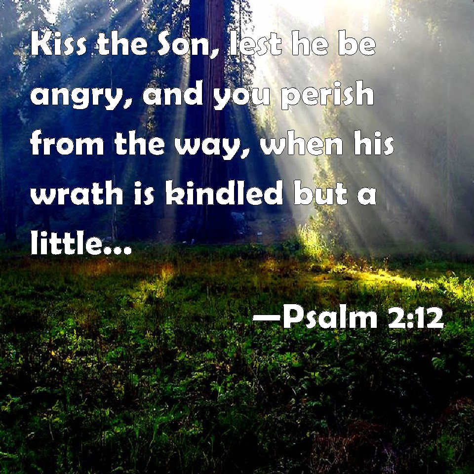 Choose a Background Psalm 2:12 Kiss the Son, lest he be angry, and you perish from the way, when his wrath is kindled but a little. Blessed are all they that put their trust in him. KJV: Kiss the Son, lest he be angry, and ye perish from the way, when his wrath is kindled but a little. Blessed are all they that put their trust in him. DRB: Embrace discipline, lest at any time the Lord be angry, and you perish from the just way. When his wrath shall be kindled in a short time, blessed are all they that trust in him. DBT: Kiss the Son, lest he be angry, and ye perish in the way, though his anger burn but a little. Blessed are all who have their trust in him. ERV: Kiss the son, lest he be angry, and ye perish in the way, for his wrath will soon be kindled. Blessed are all they that put their trust in him. WBT: Kiss the Son, lest he be angry, and ye perish from the way, when his wrath is kindled but a little. Blessed are all they that put their trust in him. WEB: Give sincere homage to the Son, lest he be angry, and you perish in the way, for his wrath will soon be kindled. Blessed are all those who take refuge in him. A Psalm by David, when he fled from Absalom his son. YLT: Kiss the Chosen One, lest He be angry, And ye lose the way, When His anger burneth but a little, O the happiness of all trusting in Him!Links Psalm 2:12 NIV • Psalm 2:12 NLT • Psalm 2:12 ESV • Psalm 2:12 NASB • Psalm 2:12 KJV • Psalm 2:12 Interlinear • Psalm 2:12 Commentaries • Psalm 2:12 Parallel Texts • Psalm 2:12 Bible Apps • Psalm 2:12 Parallel • Bible Hub |