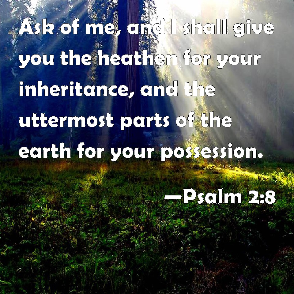 Choose a Background Psalm 2:8 Ask of me, and I shall give you the heathen for your inheritance, and the uttermost parts of the earth for your possession. KJV: Ask of me, and I shall give thee the heathen for thine inheritance, and the uttermost parts of the earth for thy possession. DRB: Ask of me, and I will give thee the Gentiles for thy inheritance, and the utmost parts of the earth for thy possession. DBT: Ask of me, and I will give thee nations for an inheritance, and for thy possession the ends of the earth: ERV: Ask of me, and I will give thee the nations for thine inheritance, and the uttermost parts of the earth for thy possession. WBT: Ask of me, and I will give thee the heathen for thy inheritance, and the uttermost parts of the earth for thy possession. WEB: Ask of me, and I will give the nations for your inheritance, the uttermost parts of the earth for your possession. YLT: Ask of Me and I give nations — thy inheritance, And thy possession — the ends of earth.Links Psalm 2:8 NIV • Psalm 2:8 NLT • Psalm 2:8 ESV • Psalm 2:8 NASB • Psalm 2:8 KJV • Psalm 2:8 Interlinear • Psalm 2:8 Commentaries • Psalm 2:8 Parallel Texts • Psalm 2:8 Bible Apps • Psalm 2:8 Parallel • Bible Hub |