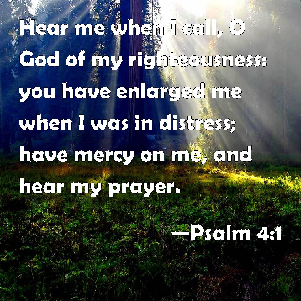 Choose a Background Psalm 4:1 Hear me when I call, O God of my righteousness: you have enlarged me when I was in distress; have mercy on me, and hear my prayer. KJV: {To the chief Musician on Neginoth, A Psalm of David.} Hear me when I call, O God of my righteousness: thou hast enlarged me when I was in distress; have mercy upon me, and hear my prayer. DRB: Unto the end, in verses. A psalm of David. When I called upon him, the God of my justice heard me: when I was in distress, thou hast enlarged me. Have mercy on me: and hear my prayer. DBT: {To the chief Musician. On stringed instruments. A Psalm of David.} When I call, answer me, O God of my righteousness: in pressure thou hast enlarged me; be gracious unto me, and hear my prayer. ERV: For the Chief Musician; on stringed instruments. A Psalm of David. Answer me when I call, O God of my righteousness; thou hast set me at large when I was in distress: have mercy upon me, and hear my prayer. WBT: To the chief Musician on Neginoth, A Psalm of David. Hear me when I call, O God of my righteousness: thou hast enlarged me when I was in distress; have mercy upon me, and hear my prayer. WEB: Answer me when I call, God of my righteousness. Give me relief from my distress. Have mercy on me, and hear my prayer. YLT: To the Overseer with Stringed Instruments. — A Psalm of David. In my calling answer Thou me, O God of my righteousness. In adversity Thou gavest enlargement to me; Favour me, and hear my prayer.Links Psalm 4:1 NIV • Psalm 4:1 NLT • Psalm 4:1 ESV • Psalm 4:1 NASB • Psalm 4:1 KJV • Psalm 4:1 Interlinear • Psalm 4:1 Commentaries • Psalm 4:1 Parallel Texts • Psalm 4:1 Bible Apps • Psalm 4:1 Parallel • Bible Hub |