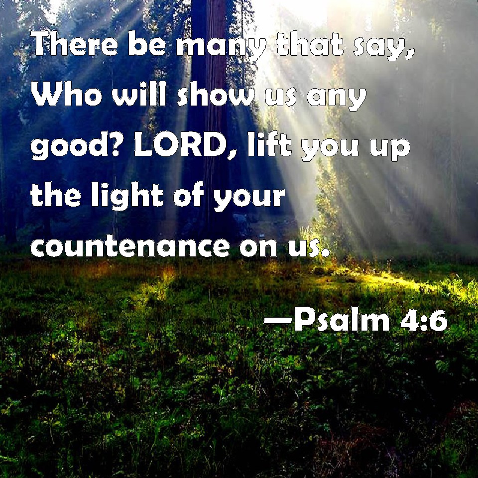 Choose a Background Psalm 4:6 There be many that say, Who will show us any good? LORD, lift you up the light of your countenance on us. KJV: There be many that say, Who will shew us any good? LORD, lift thou up the light of thy countenance upon us. DRB: The light of thy countenance O Lord, is signed upon us: thou hast given gladness in my heart. DBT: Many say, Who shall cause us to see good? Lift up upon us the light of thy countenance, O Jehovah. ERV: Many there be that say, Who will shew us any good? LORD, lift thou up the light of thy countenance upon us. WBT: There are many that say, Who will show us any good? LORD, lift thou upon us the light of thy countenance. WEB: Many say, "Who will show us any good?" Yahweh, let the light of your face shine on us. YLT: Many are saying, 'Who doth show us good?' Lift on us the light of Thy face, O Jehovah,Links Psalm 4:6 NIV • Psalm 4:6 NLT • Psalm 4:6 ESV • Psalm 4:6 NASB • Psalm 4:6 KJV • Psalm 4:6 Interlinear • Psalm 4:6 Commentaries • Psalm 4:6 Parallel Texts • Psalm 4:6 Bible Apps • Psalm 4:6 Parallel • Bible Hub |