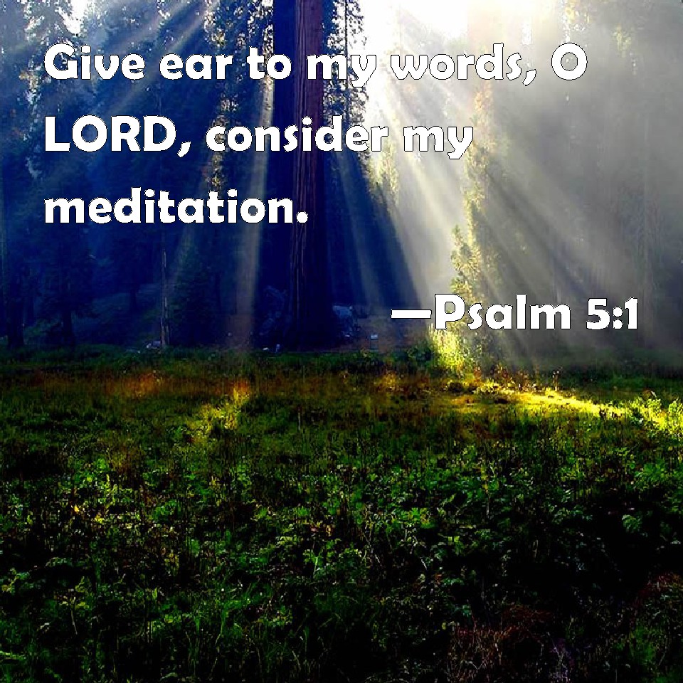 Choose a Background Psalm 5:1 Give ear to my words, O LORD, consider my meditation. KJV: {To the chief Musician upon Nehiloth, A Psalm of David.} Give ear to my words, O LORD, consider my meditation. DRB: Unto the end, for her that obtaineth the inheritance. A psalm of David. Give ear, O Lord, to my words, understand my cry. DBT: {To the chief Musician. Upon Nehiloth. A Psalm of David.} Give ear to my words, O Jehovah; consider my meditation. ERV: For the Chief Musician; with the Nehiloth. A Psalm of David. Give ear to my words, O LORD, consider my meditation. WBT: To the chief Musician upon Nehiloth, A Psalm of David. Give ear to my words, O LORD, consider my meditation. WEB: Give ear to my words, Yahweh. Consider my meditation. YLT: To the Overseer, 'Concerning the Inheritances.' — A Psalm of David. My sayings hear, O Jehovah, Consider my meditation.Links Psalm 5:1 NIV • Psalm 5:1 NLT • Psalm 5:1 ESV • Psalm 5:1 NASB • Psalm 5:1 KJV • Psalm 5:1 Interlinear • Psalm 5:1 Commentaries • Psalm 5:1 Parallel Texts • Psalm 5:1 Bible Apps • Psalm 5:1 Parallel • Bible Hub |