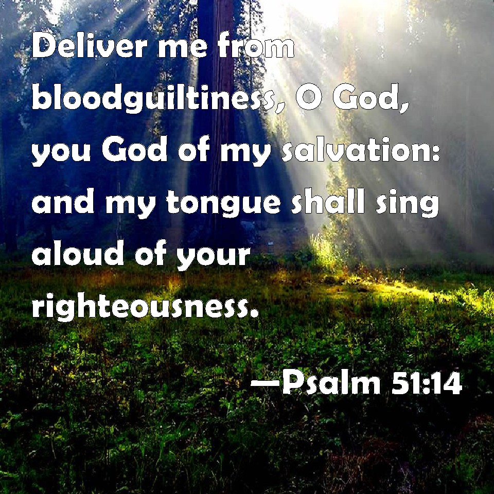 Choose a Background Psalm 51:14 Deliver me from bloodguiltiness, O God, you God of my salvation: and my tongue shall sing aloud of your righteousness. KJV: Deliver me from bloodguiltiness, O God, thou God of my salvation: and my tongue shall sing aloud of thy righteousness. DRB: Deliver me from blood, O God, thou God of my salvation: and my tongue shall extol thy justice. DBT: Deliver me from blood-guiltiness, O God, thou God of my salvation: my tongue shall sing aloud of thy righteousness. ERV: Deliver me from bloodguiltiness, O God, thou God of my salvation; and my tongue shall sing aloud of thy righteousness. WBT: Deliver me from blood-guiltiness, O God, thou God of my salvation: and my tongue shall sing aloud of thy righteousness. WEB: Deliver me from bloodguiltiness, O God, the God of my salvation. My tongue shall sing aloud of your righteousness. YLT: Deliver me from blood, O God, God of my salvation, My tongue singeth of Thy righteousness.Links Psalm 51:14 NIV • Psalm 51:14 NLT • Psalm 51:14 ESV • Psalm 51:14 NASB • Psalm 51:14 KJV • Psalm 51:14 Interlinear • Psalm 51:14 Commentaries • Psalm 51:14 Parallel Texts • Psalm 51:14 Bible Apps • Psalm 51:14 Parallel • Bible Hub |
