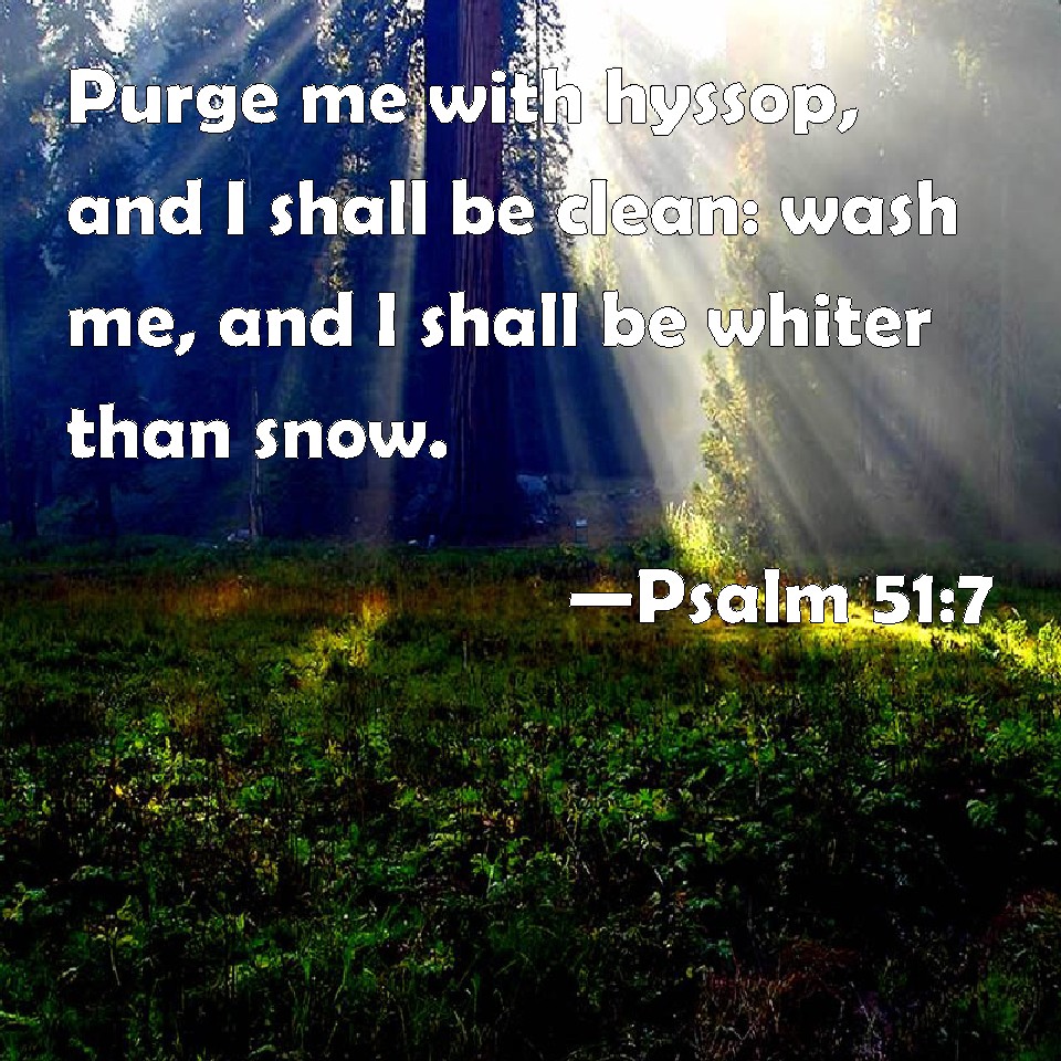 Choose a Background Psalm 51:7 Purge me with hyssop, and I shall be clean: wash me, and I shall be whiter than snow. KJV: Purge me with hyssop, and I shall be clean: wash me, and I shall be whiter than snow. DRB: Thou shalt sprinkle me with hyssop, and I shall be cleansed: thou shalt wash me, and I shall be made whiter than snow. DBT: Purge me with hyssop, and I shall be clean; wash me, and I shall be whiter than snow. ERV: Purge me with hyssop, and I shall be clean: wash me, and I shall be whiter than snow. WBT: Purge me with hyssop, and I shall be clean: wash me, and I shall be whiter than snow. WEB: Purify me with hyssop, and I will be clean. Wash me, and I will be whiter than snow. YLT: Thou cleansest me with hyssop and I am clean, Washest me, and than snow I am whiter.Links Psalm 51:7 NIV • Psalm 51:7 NLT • Psalm 51:7 ESV • Psalm 51:7 NASB • Psalm 51:7 KJV • Psalm 51:7 Interlinear • Psalm 51:7 Commentaries • Psalm 51:7 Parallel Texts • Psalm 51:7 Bible Apps • Psalm 51:7 Parallel • Bible Hub |