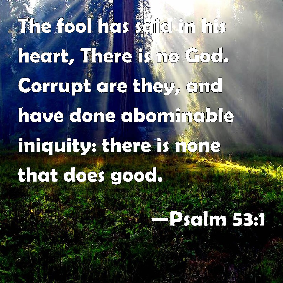 Choose a Background Psalm 53:1 The fool has said in his heart, There is no God. Corrupt are they, and have done abominable iniquity: there is none that does good. KJV: {To the chief Musician upon Mahalath, Maschil, A Psalm of David.} The fool hath said in his heart, There is no God. Corrupt are they, and have done abominable iniquity: there is none that doeth good. DRB: Unto the end, for Maeleth, understandings to David. The fool said in his hear t: There is no God. They are corrupted, and become abominable in iniquities: there is none that doth good. DBT: {To the chief Musician. On Mahalath: an instruction. Of David.} The fool hath said in his heart, There is no God! They have corrupted themselves, and have done abominable iniquity: there is none that doeth good. ERV: For the Chief Musician; set to Mahalath. Maschil of David. The fool hath said in his heart, There is no God. Corrupt are they, and have done abominable iniquity; there is none that doeth good. WBT: To the chief Musician upon Mahalath, Maschil, A Psalm of David. The fool hath said in his heart, There is no God. They are corrupt, and have done abominable iniquity: there is none that doeth good. WEB: The fool has said in his heart, "There is no God." They are corrupt, and have done abominable iniquity. There is no one who does good. YLT: To the Overseer. — 'On a disease.' — An instruction, by David. A fool said in his heart, 'There is no God.' They have done corruptly, Yea, they have done abominable iniquity, There is none doing good.Links Psalm 53:1 NIV • Psalm 53:1 NLT • Psalm 53:1 ESV • Psalm 53:1 NASB • Psalm 53:1 KJV • Psalm 53:1 Interlinear • Psalm 53:1 Commentaries • Psalm 53:1 Parallel Texts • Psalm 53:1 Bible Apps • Psalm 53:1 Parallel • Bible Hub |