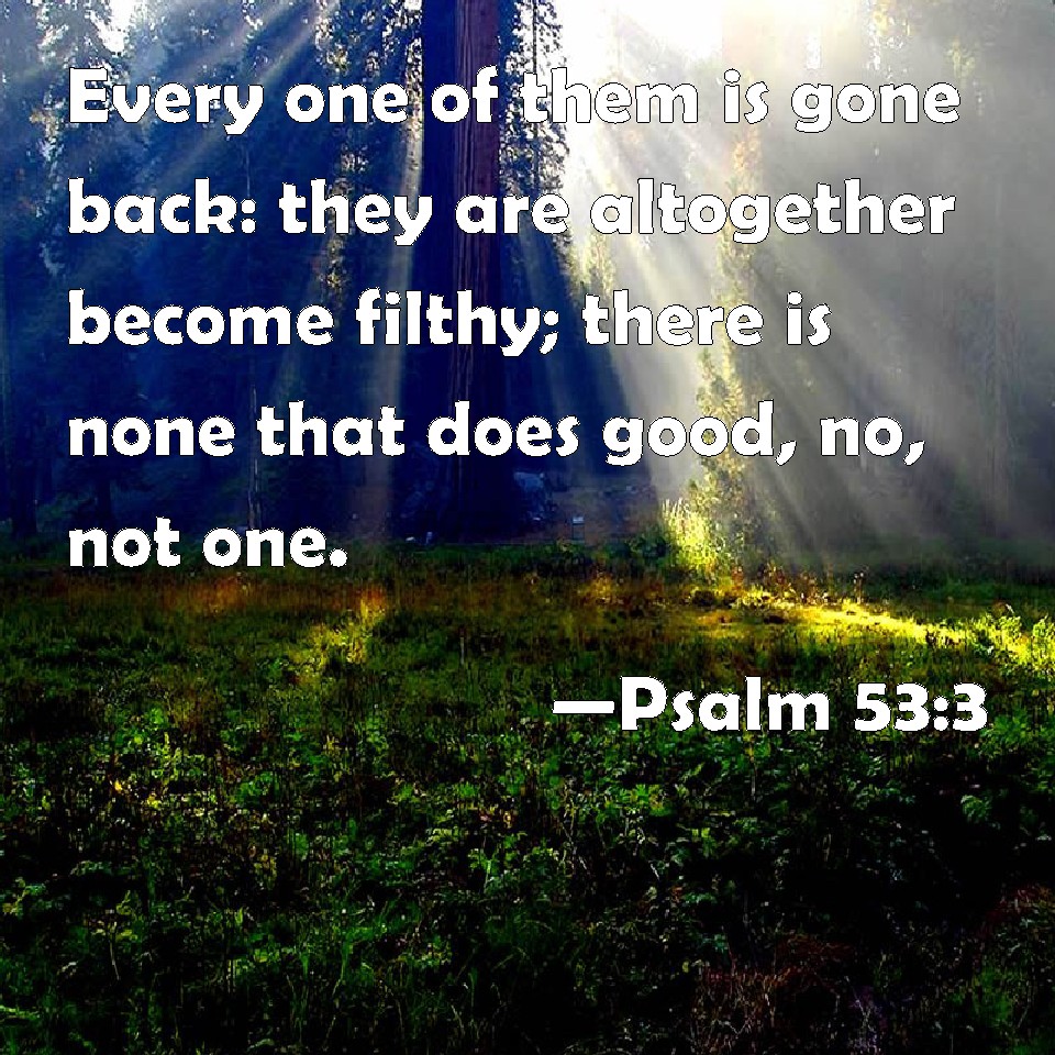 Choose a Background Psalm 53:3 Every one of them is gone back: they are altogether become filthy; there is none that does good, no, not one. KJV: Every one of them is gone back: they are altogether become filthy; there is none that doeth good, no, not one. DRB: All have gone aside, they are become unprofitable together, there is none that doth good, no not one. DBT: Every one of them is gone back, they are together become corrupt: there is none that doeth good, not even one. ERV: Every one of them is gone back; they are together become filthy; there is none that doeth good, no, not one. WBT: Every one of them is gone back: they are altogether become filthy; there is none that doeth good, no, not one. WEB: Every one of them has gone back. They have become filthy together. There is no one who does good, no, not one. YLT: Every one went back, together they became filthy, There is none doing good — not even one.Links Psalm 53:3 NIV • Psalm 53:3 NLT • Psalm 53:3 ESV • Psalm 53:3 NASB • Psalm 53:3 KJV • Psalm 53:3 Interlinear • Psalm 53:3 Commentaries • Psalm 53:3 Parallel Texts • Psalm 53:3 Bible Apps • Psalm 53:3 Parallel • Bible Hub |