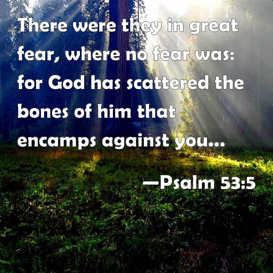 Choose a Background Psalm 53:5 There were they in great fear, where no fear was: for God has scattered the bones of him that encamps against you: you have put them to shame, because God has despised them. KJV: There were they in great fear, where no fear was: for God hath scattered the bones of him that encampeth against thee: thou hast put them to shame, because God hath despised them. DRB: They have not called upon God: there have they trembled for fear, where there was no fear. For God hath scattered the bones of them that please men: they have been confounded, because God hath despised them. DBT: There were they in great fear, where no fear was; for God scattereth the bones of him that encampeth against thee. Thou hast put them to shame, for God hath despised them. ERV: There were they in great fear, where no fear was: for God hath scattered the bones of him that encampeth against thee; thou hast put them to shame, because God hath rejected them. WBT: There they were in great fear, where no fear was: for God hath scattered the bones of him that encampeth against thee: thou hast put them to shame, because God hath despised them. WEB: There they were in great fear, where no fear was, for God has scattered the bones of him who encamps against you. You have put them to shame, because God has rejected them. YLT: There they feared a fear — there was no fear, For God hath scattered the bones of him Who is encamping against thee, Thou hast put to shame, For God hath despised them.Links Psalm 53:5 NIV • Psalm 53:5 NLT • Psalm 53:5 ESV • Psalm 53:5 NASB • Psalm 53:5 KJV • Psalm 53:5 Interlinear • Psalm 53:5 Commentaries • Psalm 53:5 Parallel Texts • Psalm 53:5 Bible Apps • Psalm 53:5 Parallel • Bible Hub |