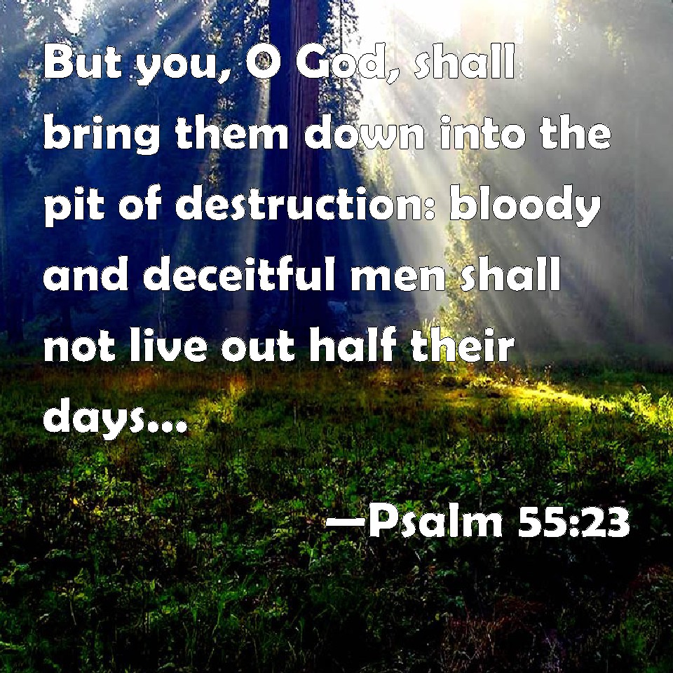 Choose a Background Psalm 55:23 But you, O God, shall bring them down into the pit of destruction: bloody and deceitful men shall not live out half their days; but I will trust in you. KJV: But thou, O God, shalt bring them down into the pit of destruction: bloody and deceitful men shall not live out half their days; but I will trust in thee. DRB: But thou, O God, shalt bring them down into the pit of destruction. Bloody and deceitful men shall not live out half their days; but I will trust in thee, O Lord. DBT: And thou, O God, wilt bring them down into the pit of destruction: bloody and deceitful men shall not live out half their days. But as for me, I will confide in thee. ERV: But thou, O God, shalt bring them down into the pit of destruction: bloodthirsty and deceitful men shall not live out half their days; but I will trust in thee. WBT: But thou, O God, wilt bring them down into the pit of destruction: bloody and deceitful men shall not live out half their days; but I will trust in thee. WEB: But you, God, will bring them down into the pit of destruction. Bloodthirsty and deceitful men shall not live out half their days, but I will trust in you. For the Chief Musician. To the tune of "Silent Dove in Distant Lands." A poem by David, when the Philistines seized him in Gath. YLT: And Thou, O God, dost bring them down To a pit of destruction, Men of blood and deceit reach not to half their days, And I — I do trust in Thee!Links Psalm 55:23 NIV • Psalm 55:23 NLT • Psalm 55:23 ESV • Psalm 55:23 NASB • Psalm 55:23 KJV • Psalm 55:23 Interlinear • Psalm 55:23 Commentaries • Psalm 55:23 Parallel Texts • Psalm 55:23 Bible Apps • Psalm 55:23 Parallel • Bible Hub |