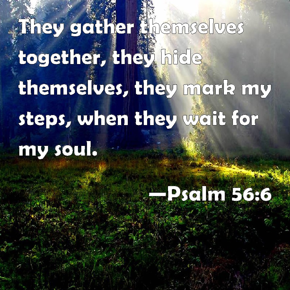Choose a Background Psalm 56:6 They gather themselves together, they hide themselves, they mark my steps, when they wait for my soul. KJV: They gather themselves together, they hide themselves, they mark my steps, when they wait for my soul. DRB: They will dwell and hide themselves: they will watch my heel. As they have waited for my soul, DBT: They gather themselves together, they hide themselves; they mark my steps, because they wait for my soul. ERV: They gather themselves together, they hide themselves, they mark my steps, even as they have waited for my soul. WBT: They assemble themselves, they hide themselves, they mark my steps, when they wait for my soul. WEB: They conspire and lurk, watching my steps, they are eager to take my life. YLT: They assemble, they hide, they watch my heels, When they have expected my soul.Links Psalm 56:6 NIV • Psalm 56:6 NLT • Psalm 56:6 ESV • Psalm 56:6 NASB • Psalm 56:6 KJV • Psalm 56:6 Interlinear • Psalm 56:6 Commentaries • Psalm 56:6 Parallel Texts • Psalm 56:6 Bible Apps • Psalm 56:6 Parallel • Bible Hub |