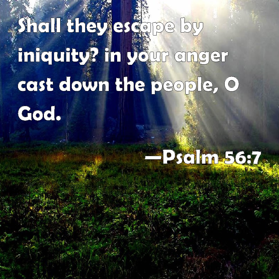 Choose a Background Psalm 56:7 Shall they escape by iniquity? in your anger cast down the people, O God. KJV: Shall they escape by iniquity? in thine anger cast down the people, O God. DRB: for nothing shalt thou save them: in thy anger thou shalt break the people in pieces, O God, DBT: Shall they escape by iniquity? In anger cast down the peoples, O God. ERV: Shall they escape by iniquity? in anger cast down the peoples, O God. WBT: Shall they escape by iniquity; in thy anger cast down the people, O God. WEB: Shall they escape by iniquity? In anger cast down the peoples, God. YLT: By iniquity they escape, In anger the peoples put down, O God.Links Psalm 56:7 NIV • Psalm 56:7 NLT • Psalm 56:7 ESV • Psalm 56:7 NASB • Psalm 56:7 KJV • Psalm 56:7 Interlinear • Psalm 56:7 Commentaries • Psalm 56:7 Parallel Texts • Psalm 56:7 Bible Apps • Psalm 56:7 Parallel • Bible Hub |