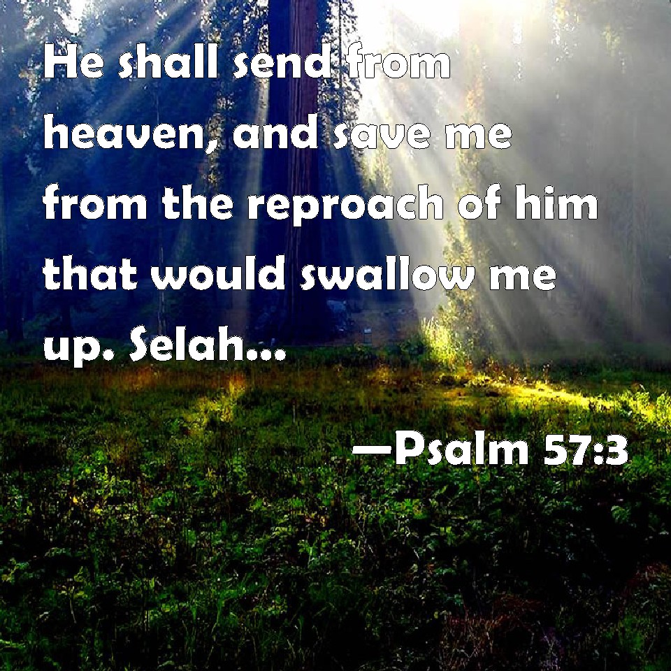 Choose a Background Psalm 57:3 He shall send from heaven, and save me from the reproach of him that would swallow me up. Selah. God shall send forth his mercy and his truth. KJV: He shall send from heaven, and save me from the reproach of him that would swallow me up. Selah. God shall send forth his mercy and his truth. DRB: He hath sent from heaven and delivered me: he hath made them a reproach that trod upon me. God hath sent his mercy and his truth, DBT: He will send from the heavens and save me; he hath covered with reproach him that would swallow me up. Selah. God hath sent forth his loving-kindness and his truth. ERV: He shall send from heaven, and save me, when he that would swallow me up reproacheth; Selah God shall send forth his mercy and his truth. WBT: He shall send from heaven, and save me from the reproach of him that would swallow me up. Selah. God shall send forth his mercy and his truth. WEB: He will send from heaven, and save me, he rebukes the one who is pursuing me. Selah. God will send out his loving kindness and his truth. YLT: He sendeth from the heaven, and saveth me, He reproached — who is panting after me. Selah. God sendeth forth His kindness and His truth.Links Psalm 57:3 NIV • Psalm 57:3 NLT • Psalm 57:3 ESV • Psalm 57:3 NASB • Psalm 57:3 KJV • Psalm 57:3 Interlinear • Psalm 57:3 Commentaries • Psalm 57:3 Parallel Texts • Psalm 57:3 Bible Apps • Psalm 57:3 Parallel • Bible Hub |