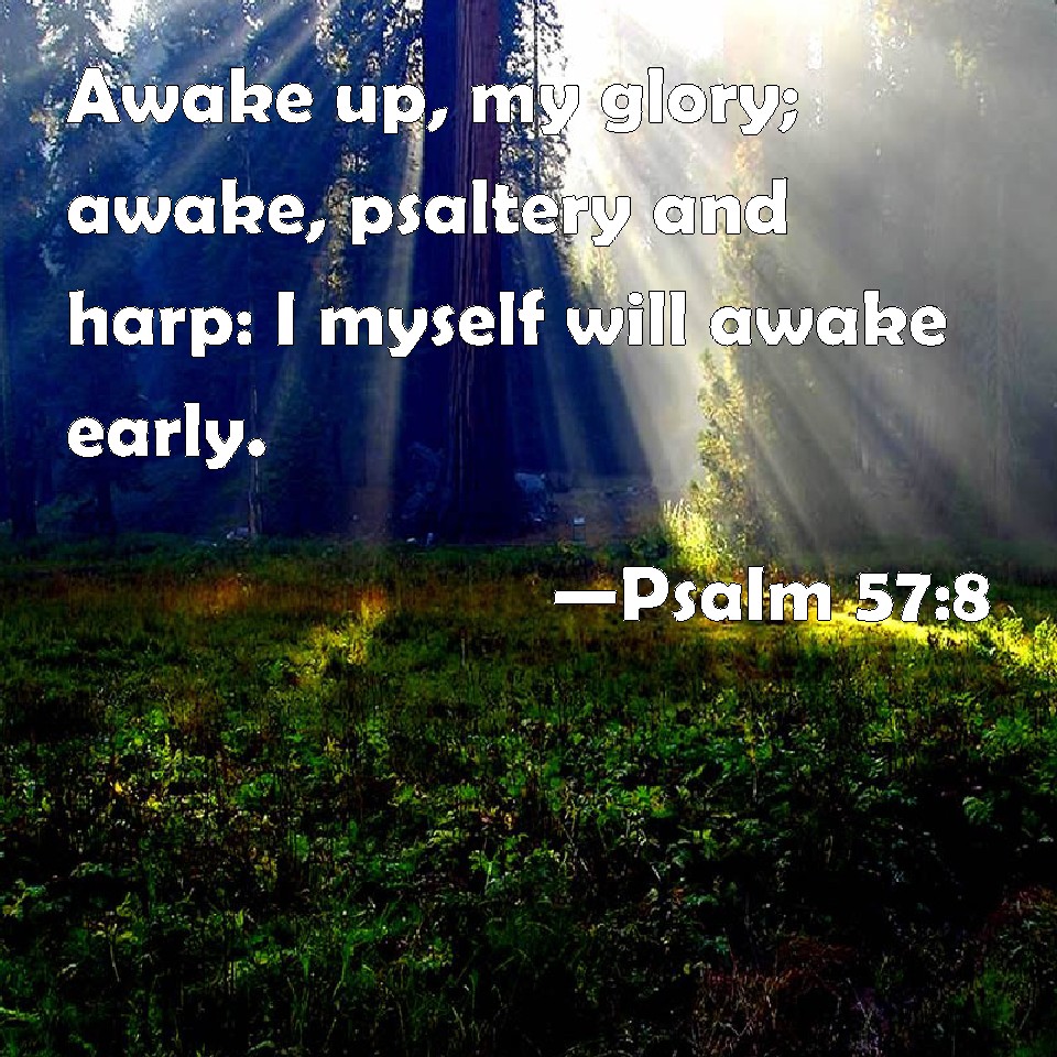 Choose a Background Psalm 57:8 Awake up, my glory; awake, psaltery and harp: I myself will awake early. KJV: Awake up, my glory; awake, psaltery and harp: I myself will awake early. DRB: Arise, O my glory, arise psaltery and harp: I will arise early. DBT: Awake, my glory; awake, lute and harp: I will wake the dawn. ERV: Awake up, my glory; awake, psaltery and harp: I myself will awake right early. WBT: Awake, my glory; awake, psaltery and harp: I myself will awake early. WEB: Wake up, my glory! Wake up, psaltery and harp! I will wake up the dawn. YLT: Awake, mine honour, awake, psaltery and harp, I awake the morning dawn.Links Psalm 57:8 NIV • Psalm 57:8 NLT • Psalm 57:8 ESV • Psalm 57:8 NASB • Psalm 57:8 KJV • Psalm 57:8 Interlinear • Psalm 57:8 Commentaries • Psalm 57:8 Parallel Texts • Psalm 57:8 Bible Apps • Psalm 57:8 Parallel • Bible Hub |