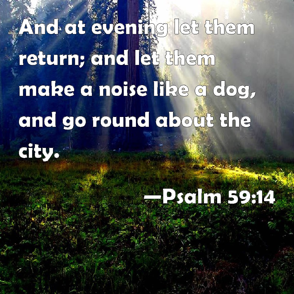Choose a Background Psalm 59:14 And at evening let them return; and let them make a noise like a dog, and go round about the city. KJV: And at evening let them return; and let them make a noise like a dog, and go round about the city. DRB: They shall return at evening and shall suffer hunger like dogs: and shall go round about the city. DBT: And in the evening they shall return, they shall howl like a dog, and go round about the city. ERV: And at evening let them return, let them make a noise like a dog, and go round about the city. WBT: And at evening let them return; and let them make a noise like a dog, and go about the city. WEB: At evening let them return. Let them howl like a dog, and go around the city. YLT: And they turn back at evening, They make a noise like a dog, And they go round about the city.Links Psalm 59:14 NIV • Psalm 59:14 NLT • Psalm 59:14 ESV • Psalm 59:14 NASB • Psalm 59:14 KJV • Psalm 59:14 Interlinear • Psalm 59:14 Commentaries • Psalm 59:14 Parallel Texts • Psalm 59:14 Bible Apps • Psalm 59:14 Parallel • Bible Hub |