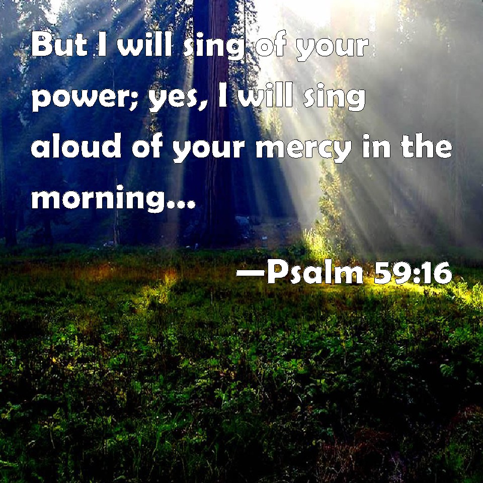 Choose a Background Psalm 59:16 But I will sing of your power; yes, I will sing aloud of your mercy in the morning: for you have been my defense and refuge in the day of my trouble. KJV: But I will sing of thy power; yea, I will sing aloud of thy mercy in the morning: for thou hast been my defence and refuge in the day of my trouble. DRB: But I will sing thy strength: and will extol thy mercy in the morning. For thou art become my support, and my refuge, in the day of my trouble. DBT: But as for me, I will sing of thy strength; yea, I will sing aloud of thy loving-kindness in the morning; for thou hast been to me a high fortress, and a refuge in the day of my trouble. ERV: But I will sing of thy strength; yea, I will sing aloud of thy mercy in the morning: for thou hast been my high tower, and a refuge in the day of my distress. WBT: But I will sing of thy power; yes, I will sing aloud of thy mercy in the morning: for thou hast been my defense and refuge in the day of my trouble. WEB: But I will sing of your strength. Yes, I will sing aloud of your loving kindness in the morning. For you have been my high tower, a refuge in the day of my distress. YLT: And I — I sing of Thy strength, And I sing at morn of Thy kindness, For thou hast been a tower to me, And a refuge for me in a day of adversity.Links Psalm 59:16 NIV • Psalm 59:16 NLT • Psalm 59:16 ESV • Psalm 59:16 NASB • Psalm 59:16 KJV • Psalm 59:16 Interlinear • Psalm 59:16 Commentaries • Psalm 59:16 Parallel Texts • Psalm 59:16 Bible Apps • Psalm 59:16 Parallel • Bible Hub |