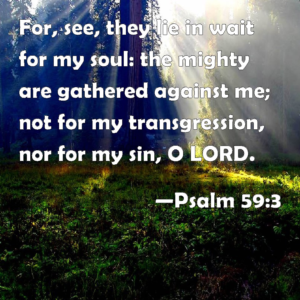 Choose a Background Psalm 59:3 For, see, they lie in wait for my soul: the mighty are gathered against me; not for my transgression, nor for my sin, O LORD. KJV: For, lo, they lie in wait for my soul: the mighty are gathered against me; not for my transgression, nor for my sin, O LORD. DRB: For behold they have caught my soul: the mighty have rushed in upon me: DBT: For behold, they lie in wait for my soul; strong ones are gathered against me: not for my transgression, nor for my sin, O Jehovah. ERV: For, lo, they lie in wait for my soul; the mighty gather themselves together against me: not for my transgression, nor for my sin, O LORD. WBT: For lo, they lie in wait for my soul: the mighty are gathered against me; not for my transgression, nor for my sin, O LORD. WEB: For, behold, they lie in wait for my soul. The mighty gather themselves together against me, not for my disobedience, nor for my sin, Yahweh. YLT: For, lo, they laid wait for my soul, Assembled against me are strong ones, Not my transgression nor my sin, O Jehovah.Links Psalm 59:3 NIV • Psalm 59:3 NLT • Psalm 59:3 ESV • Psalm 59:3 NASB • Psalm 59:3 KJV • Psalm 59:3 Interlinear • Psalm 59:3 Commentaries • Psalm 59:3 Parallel Texts • Psalm 59:3 Bible Apps • Psalm 59:3 Parallel • Bible Hub |