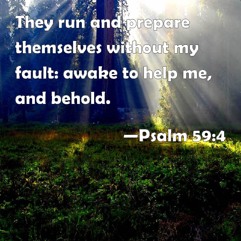 Choose a Background Psalm 59:4 They run and prepare themselves without my fault: awake to help me, and behold. KJV: They run and prepare themselves without my fault: awake to help me, and behold. DRB: Neither is it my iniquity, nor my sin, O Lord: without iniquity have I run, and directed my steps. DBT: They run and prepare themselves without my fault: awake to meet me, and behold. ERV: They run and prepare themselves without my fault: awake thou to help me, and behold. WBT: They run and prepare themselves without my fault: awake to help me, and behold. WEB: I have done no wrong, yet they are ready to attack me. Rise up, behold, and help me! YLT: Without punishment they run and prepare themselves, Stir up to meet me, and see.Links Psalm 59:4 NIV • Psalm 59:4 NLT • Psalm 59:4 ESV • Psalm 59:4 NASB • Psalm 59:4 KJV • Psalm 59:4 Interlinear • Psalm 59:4 Commentaries • Psalm 59:4 Parallel Texts • Psalm 59:4 Bible Apps • Psalm 59:4 Parallel • Bible Hub |