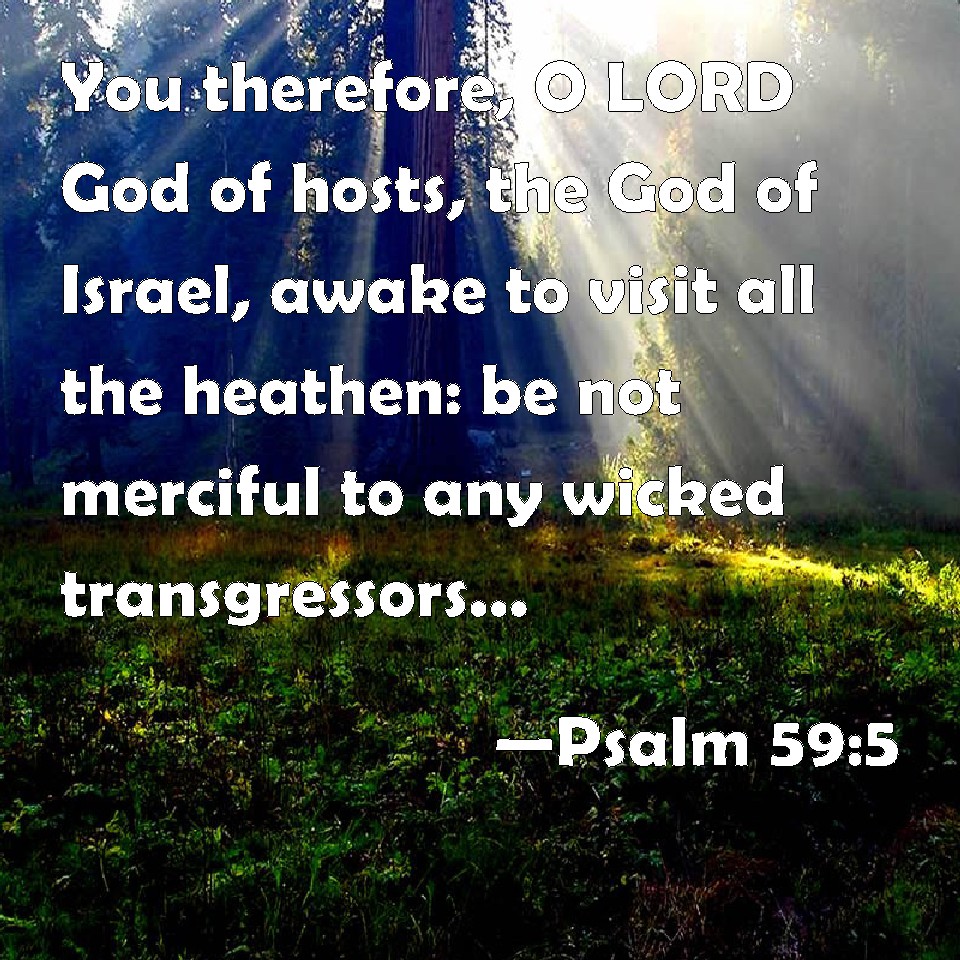 Choose a Background Psalm 59:5 You therefore, O LORD God of hosts, the God of Israel, awake to visit all the heathen: be not merciful to any wicked transgressors. Selah. KJV: Thou therefore, O LORD God of hosts, the God of Israel, awake to visit all the heathen: be not merciful to any wicked transgressors. Selah. DRB: Rise up thou to meet me, and behold: even thou, O Lord, the God of hosts, the God of Israel. Attend to visit all the nations: have no mercy on all them that work iniquity. DBT: Yea, do thou, Jehovah, the God of hosts, the God of Israel, arise to visit all the nations: be not gracious to any plotters of iniquity. Selah. ERV: Even thou, O LORD God of hosts, the God of Israel, arise to visit all the heathen: be not merciful to any wicked transgressors. Selah WBT: Thou therefore, O LORD God of hosts, the God of Israel, awake to visit all the heathen: be not merciful to any wicked transgressors. Selah. WEB: You, Yahweh God of Armies, the God of Israel, rouse yourself to punish the nations. Show no mercy to the wicked traitors. Selah. YLT: And Thou, Jehovah, God of Hosts, God of Israel, Awake to inspect all the nations. Favour not any treacherous dealers of iniquity. Selah.Links Psalm 59:5 NIV • Psalm 59:5 NLT • Psalm 59:5 ESV • Psalm 59:5 NASB • Psalm 59:5 KJV • Psalm 59:5 Interlinear • Psalm 59:5 Commentaries • Psalm 59:5 Parallel Texts • Psalm 59:5 Bible Apps • Psalm 59:5 Parallel • Bible Hub |