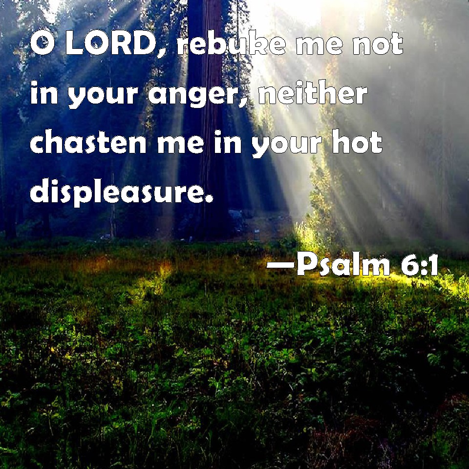 Choose a Background Psalm 6:1 O LORD, rebuke me not in your anger, neither chasten me in your hot displeasure. KJV: {To the chief Musician on Neginoth upon Sheminith, A Psalm of David.} O LORD, rebuke me not in thine anger, neither chasten me in thy hot displeasure. DRB: Unto the end, in verses, a psalm for David, for the octave. O Lord, rebuke me not in thy indignation, nor chastise me in thy wrath. DBT: {To the chief Musician. On stringed instruments, upon Sheminith. A Psalm of David.} Jehovah, rebuke me not in thine anger, and chasten me not in thy hot displeasure. ERV: For the Chief Musician; on stringed instruments, set to the Sheminith. A Psalm of David. O LORD, rebuke me not in thine anger, neither chasten me in thy hot displeasure. WBT: To the chief Musician on Neginoth upon Sheminith, A Psalm of David. O LORD, rebuke me not in thy anger, neither chasten me in thy hot displeasure. WEB: Yahweh, don't rebuke me in your anger, neither discipline me in your wrath. YLT: To the Overseer with stringed instruments, on the octave. — A Psalm of David. O Jehovah, in Thine anger reprove me not, Nor in Thy fury chastise me.Links Psalm 6:1 NIV • Psalm 6:1 NLT • Psalm 6:1 ESV • Psalm 6:1 NASB • Psalm 6:1 KJV • Psalm 6:1 Interlinear • Psalm 6:1 Commentaries • Psalm 6:1 Parallel Texts • Psalm 6:1 Bible Apps • Psalm 6:1 Parallel • Bible Hub |