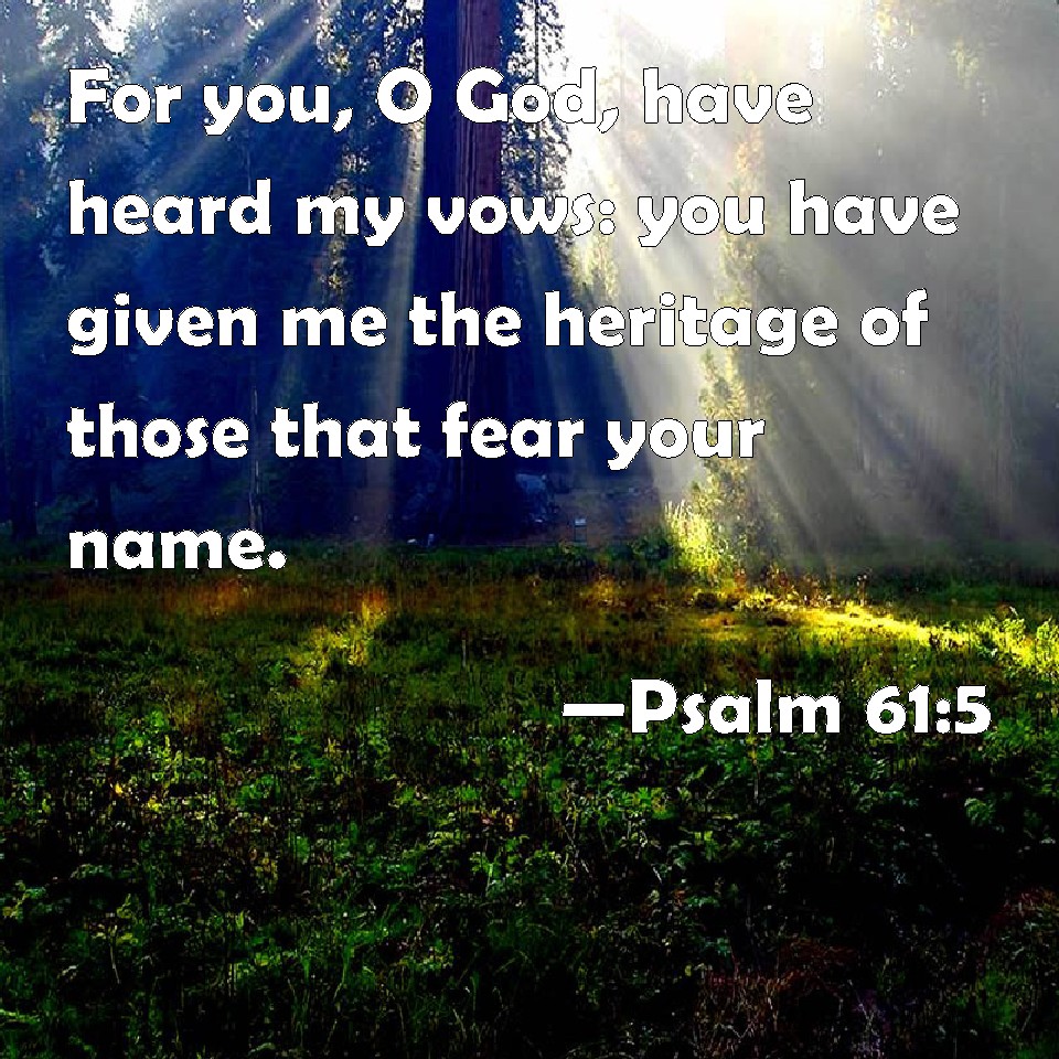Choose a Background Psalm 61:5 For you, O God, have heard my vows: you have given me the heritage of those that fear your name. KJV: For thou, O God, hast heard my vows: thou hast given me the heritage of those that fear thy name. DRB: For thou, my God, hast heard my prayer: thou hast given an inheritance to them that fear thy name. DBT: For thou, O God, hast heard my vows; thou hast given me the inheritance of those that fear thy name. ERV: For thou, O God, hast heard my vows: thou hast given me the heritage of those that fear thy name. WBT: For thou, O God, hast heard my vows: thou hast given me the heritage of those that fear thy name. WEB: For you, God, have heard my vows. You have given me the heritage of those who fear your name. YLT: For Thou, O God, hast hearkened to my vows, Thou hast appointed the inheritance Of those fearing Thy name.Links Psalm 61:5 NIV • Psalm 61:5 NLT • Psalm 61:5 ESV • Psalm 61:5 NASB • Psalm 61:5 KJV • Psalm 61:5 Interlinear • Psalm 61:5 Commentaries • Psalm 61:5 Parallel Texts • Psalm 61:5 Bible Apps • Psalm 61:5 Parallel • Bible Hub |