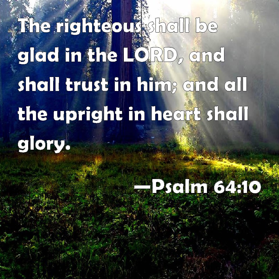 Psalm 64:10 The righteous shall be glad in the LORD, and shall trust in him; and all the upright in heart shall glory.