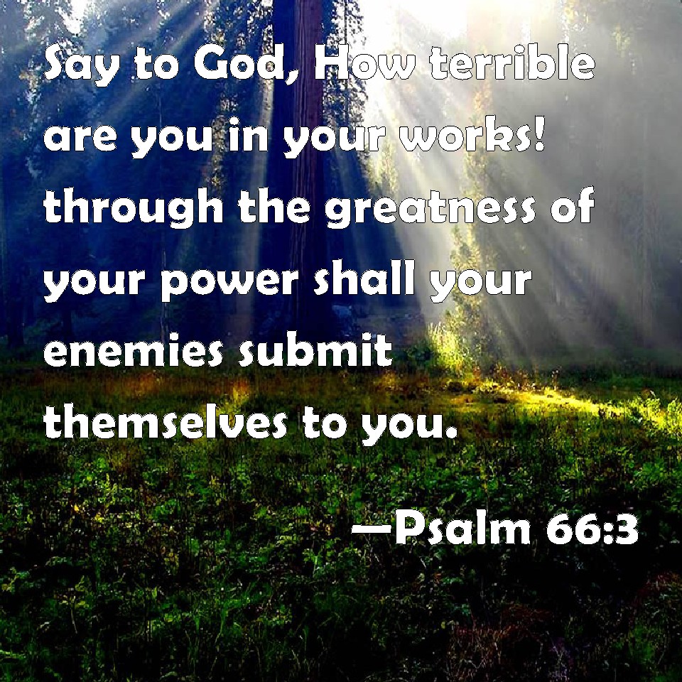 Choose a Background Psalm 66:3 Say to God, How terrible are you in your works! through the greatness of your power shall your enemies submit themselves to you. KJV: Say unto God, How terrible art thou in thy works! through the greatness of thy power shall thine enemies submit themselves unto thee. DRB: Say unto God, How terrible are thy works, O Lord! in the multitude of thy strength thy enemies shall lie to thee. DBT: Say unto God, How terrible are thy works! because of the greatness of thy strength, thine enemies come cringing unto thee. ERV: Say unto God, How terrible are thy works! through the greatness of thy power shall thine enemies submit themselves unto thee. WBT: Say to God, How terrible art thou in thy works! through the greatness of thy power shall thy enemies submit themselves to thee. WEB: Tell God, "How awesome are your deeds! Through the greatness of your power, your enemies submit themselves to you. YLT: Say to God, 'How fearful are Thy works, By the abundance of Thy strength, Thine enemies feign obedience to Thee.Links Psalm 66:3 NIV • Psalm 66:3 NLT • Psalm 66:3 ESV • Psalm 66:3 NASB • Psalm 66:3 KJV • Psalm 66:3 Interlinear • Psalm 66:3 Commentaries • Psalm 66:3 Parallel Texts • Psalm 66:3 Bible Apps • Psalm 66:3 Parallel • Bible Hub |