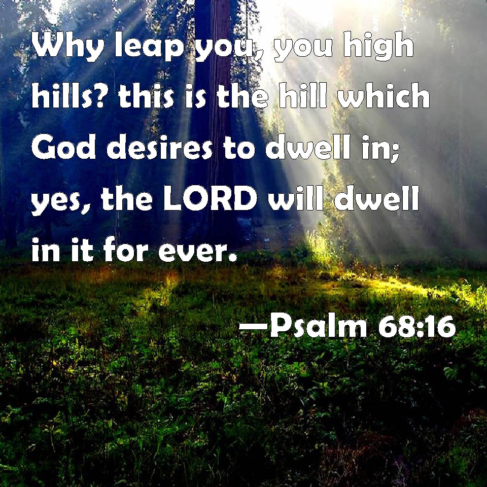 Choose a Background Psalm 68:16 Why leap you, you high hills? this is the hill which God desires to dwell in; yes, the LORD will dwell in it for ever. KJV: Why leap ye, ye high hills? this is the hill which God desireth to dwell in; yea, the LORD will dwell in it for ever. DRB: Why suspect, ye curdled mountains? A mountain in which God is well pleased to dwell: for there the Lord shall dwell unto the end. DBT: Why do ye look with envy, ye many-peaked mountains, upon the mount that God hath desired for his abode? yea, Jehovah will dwell there for ever. ERV: Why look ye askance, ye high mountains, at the mountain which God hath desired for his abode? yea, the LORD will dwell in it for ever. WBT: Why leap ye, ye lofty hills? this is the hill which God desireth to dwell in; yes, the LORD will dwell in it for ever. WEB: Why do you look in envy, you rugged mountains, at the mountain where God chooses to reign? Yes, Yahweh will dwell there forever. YLT: Why do ye envy, O high hills, The hill God hath desired for His seat? Jehovah also doth tabernacle for ever.Links Psalm 68:16 NIV • Psalm 68:16 NLT • Psalm 68:16 ESV • Psalm 68:16 NASB • Psalm 68:16 KJV • Psalm 68:16 Interlinear • Psalm 68:16 Commentaries • Psalm 68:16 Parallel Texts • Psalm 68:16 Bible Apps • Psalm 68:16 Parallel • Bible Hub |