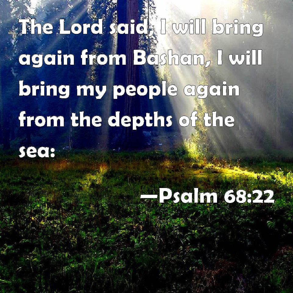 Choose a Background Psalm 68:22 The Lord said, I will bring again from Bashan, I will bring my people again from the depths of the sea: KJV: The Lord said, I will bring again from Bashan, I will bring my people again from the depths of the sea: DRB: The Lord said: I will turn them from Basan, I will turn them into the depth of the sea: DBT: The Lord said, I will bring again from Bashan, I will bring them again from the depth of the sea; ERV: The Lord said, I will bring again from Bashan, I will bring them again from the depths of the sea: WBT: The Lord said, I will bring again from Bashan, I will bring my people again from the depths of the sea. WEB: The Lord said, "I will bring you again from Bashan, I will bring you again from the depths of the sea; YLT: The Lord said: 'From Bashan I bring back, I bring back from the depths of the sea.Links Psalm 68:22 NIV • Psalm 68:22 NLT • Psalm 68:22 ESV • Psalm 68:22 NASB • Psalm 68:22 KJV • Psalm 68:22 Interlinear • Psalm 68:22 Commentaries • Psalm 68:22 Parallel Texts • Psalm 68:22 Bible Apps • Psalm 68:22 Parallel • Bible Hub |