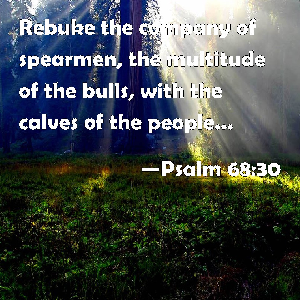 Choose a Background Psalm 68:30 Rebuke the company of spearmen, the multitude of the bulls, with the calves of the people, till every one submit himself with pieces of silver: scatter you the people that delight in war. KJV: Rebuke the company of spearmen, the multitude of the bulls, with the calves of the people, till every one submit himself with pieces of silver: scatter thou the people that delight in war. DRB: Rebuke the wild beasts of the reeds, the congregation of bulls with the kine of the people; who seek to exclude them who are tried with silver. Scatter thou the nations that delight in wars: DBT: Rebuke the beast of the reeds, the assembly of the strong, with the calves of the peoples: every one submitteth himself with pieces of silver. Scatter the peoples that delight in war. ERV: Rebuke the wild beast of the reeds, the multitude of the bulls, with the calves of the peoples, trampling under foot the pieces of silver; he hath scattered the peoples that delight in war. WBT: Rebuke the company of spearmen, the multitude of the bulls, with the calves of the people, till every one shall submit himself with pieces of silver: scatter thou the people that delight in war. WEB: Rebuke the wild animal of the reeds, the multitude of the bulls, with the calves of the peoples. Being humbled, may it bring bars of silver. Scatter the nations that delight in war. YLT: Rebuke a beast of the reeds, a company of bulls, With calves of the peoples, Each humbling himself with pieces of silver, Scatter Thou peoples delighting in conflicts.Links Psalm 68:30 NIV • Psalm 68:30 NLT • Psalm 68:30 ESV • Psalm 68:30 NASB • Psalm 68:30 KJV • Psalm 68:30 Interlinear • Psalm 68:30 Commentaries • Psalm 68:30 Parallel Texts • Psalm 68:30 Bible Apps • Psalm 68:30 Parallel • Bible Hub |