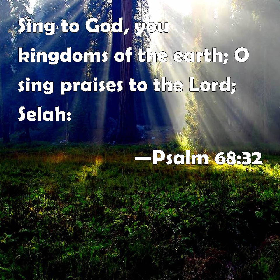 Choose a Background Psalm 68:32 Sing to God, you kingdoms of the earth; O sing praises to the Lord; Selah: KJV: Sing unto God, ye kingdoms of the earth; O sing praises unto the Lord; Selah: DRB: Sing to God, ye kingdoms of the earth: sing ye to the Lord: Sing ye to God, DBT: Ye kingdoms of the earth, sing unto God; sing psalms of the Lord, (Selah,) ERV: Sing unto God, ye kingdoms of the earth; O sing praises unto the Lord; Selah WBT: Sing to God, ye kingdoms of the earth; O sing praises to the Lord; Selah: WEB: Sing to God, you kingdoms of the earth! Sing praises to the Lord! Selah. YLT: Kingdoms of the earth, sing ye to God, Praise ye the Lord. Selah.Links Psalm 68:32 NIV • Psalm 68:32 NLT • Psalm 68:32 ESV • Psalm 68:32 NASB • Psalm 68:32 KJV • Psalm 68:32 Interlinear • Psalm 68:32 Commentaries • Psalm 68:32 Parallel Texts • Psalm 68:32 Bible Apps • Psalm 68:32 Parallel • Bible Hub |