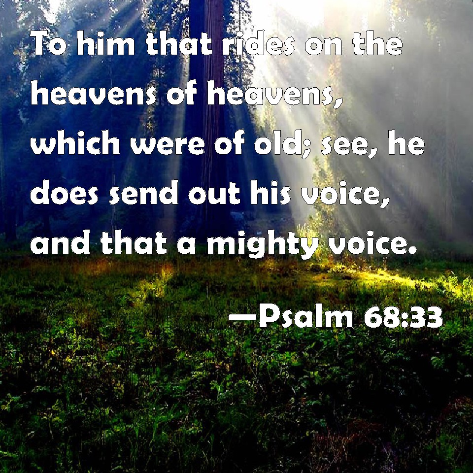 Choose a Background Psalm 68:33 To him that rides on the heavens of heavens, which were of old; see, he does send out his voice, and that a mighty voice. KJV: To him that rideth upon the heavens of heavens, which were of old; lo, he doth send out his voice, and that a mighty voice. DRB: who mounteth above the heaven of heavens, to the east. Behold he will give to his voice the voice of power: DBT: Of him that rideth upon the heavens, the heavens which are of old: lo, he uttereth his voice, a mighty voice. ERV: To him that rideth upon the heavens of heavens, which are of old; lo, he uttereth his voice, and that a mighty voice. WBT: To him that rideth upon the heavens of heavens, which were of old; lo, he doth send out his voice, and that a mighty voice. WEB: To him who rides on the heaven of heavens, which are of old; behold, he utters his voice, a mighty voice. YLT: To him who is riding on the heavens of the heavens of old, Lo, He giveth with His voice a strong voice.Links Psalm 68:33 NIV • Psalm 68:33 NLT • Psalm 68:33 ESV • Psalm 68:33 NASB • Psalm 68:33 KJV • Psalm 68:33 Interlinear • Psalm 68:33 Commentaries • Psalm 68:33 Parallel Texts • Psalm 68:33 Bible Apps • Psalm 68:33 Parallel • Bible Hub |