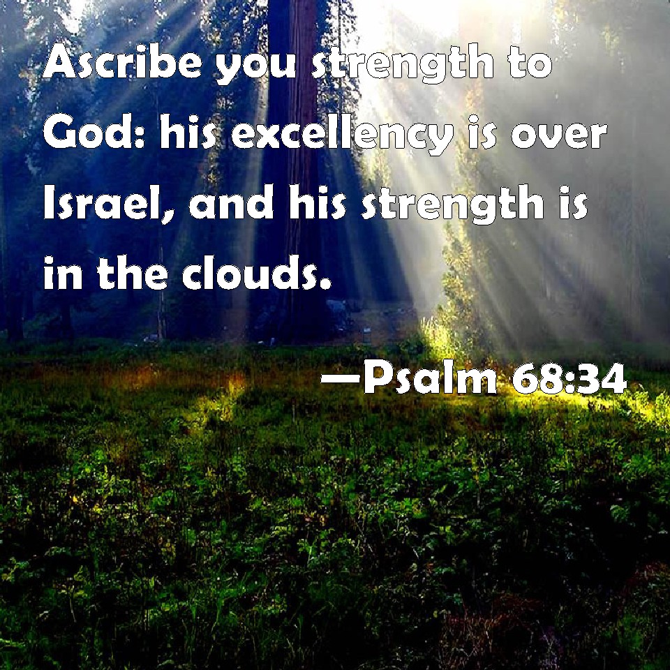 Choose a Background Psalm 68:34 Ascribe you strength to God: his excellency is over Israel, and his strength is in the clouds. KJV: Ascribe ye strength unto God: his excellency is over Israel, and his strength is in the clouds. DRB: give ye glory to God for Israel, his magnificence, and his power is in the clouds. DBT: Ascribe ye strength unto God: his excellency is over Israel, and his strength is in the clouds. ERV: Ascribe ye strength unto God: his excellency is over Israel, and his strength is in the skies. WBT: Ascribe ye strength to God: his excellence is over Israel, and his strength is in the clouds. WEB: Ascribe strength to God! His excellency is over Israel, his strength is in the skies. YLT: Ascribe ye strength to God, Over Israel is His excellency, and His strength in the clouds.Links Psalm 68:34 NIV • Psalm 68:34 NLT • Psalm 68:34 ESV • Psalm 68:34 NASB • Psalm 68:34 KJV • Psalm 68:34 Interlinear • Psalm 68:34 Commentaries • Psalm 68:34 Parallel Texts • Psalm 68:34 Bible Apps • Psalm 68:34 Parallel • Bible Hub |