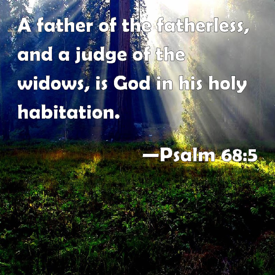 Choose a Background Psalm 68:5 A father of the fatherless, and a judge of the widows, is God in his holy habitation. KJV: A father of the fatherless, and a judge of the widows, is God in his holy habitation. DRB: who is the father of orphans, and the judge of widows. God in his holy place: DBT: A father of the fatherless, and a judge of the widows, is God in his holy habitation. ERV: A father of the fatherless, and a judge of the widows, is God in his holy habitation. WBT: A father of the fatherless, and a judge of the widows, is God in his holy habitation. WEB: A father of the fatherless, and a defender of the widows, is God in his holy habitation. YLT: Father of the fatherless, and judge of the widows, Is God in His holy habitation.Links Psalm 68:5 NIV • Psalm 68:5 NLT • Psalm 68:5 ESV • Psalm 68:5 NASB • Psalm 68:5 KJV • Psalm 68:5 Interlinear • Psalm 68:5 Commentaries • Psalm 68:5 Parallel Texts • Psalm 68:5 Bible Apps • Psalm 68:5 Parallel • Bible Hub |