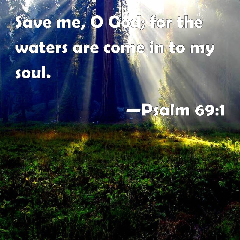 Choose a Background Psalm 69:1 Save me, O God; for the waters are come in to my soul. KJV: {To the chief Musician upon Shoshannim, A Psalm of David.} Save me, O God; for the waters are come in unto my soul. DRB: Unto the end, for them that shall be changed; for David. Save me, O God: for the waters are come in even unto my soul. DBT: {To the chief Musician. Upon Shoshannim. A Psalm of David.} Save me, O God; for the waters are come in unto my soul. ERV: For the Chief Musician; set to Shoshannim. A Psalm of David. Save me, O God; for the waters are come in unto my soul. WBT: To the chief Musician upon Shoshannim, A Psalm of David. Save me, O God; for the waters are come in to my soul. WEB: Save me, God, for the waters have come up to my neck! YLT: To the Overseer. — 'On the Lilies,' by David. Save me, O God, for come have waters unto the soul.Links Psalm 69:1 NIV • Psalm 69:1 NLT • Psalm 69:1 ESV • Psalm 69:1 NASB • Psalm 69:1 KJV • Psalm 69:1 Interlinear • Psalm 69:1 Commentaries • Psalm 69:1 Parallel Texts • Psalm 69:1 Bible Apps • Psalm 69:1 Parallel • Bible Hub |