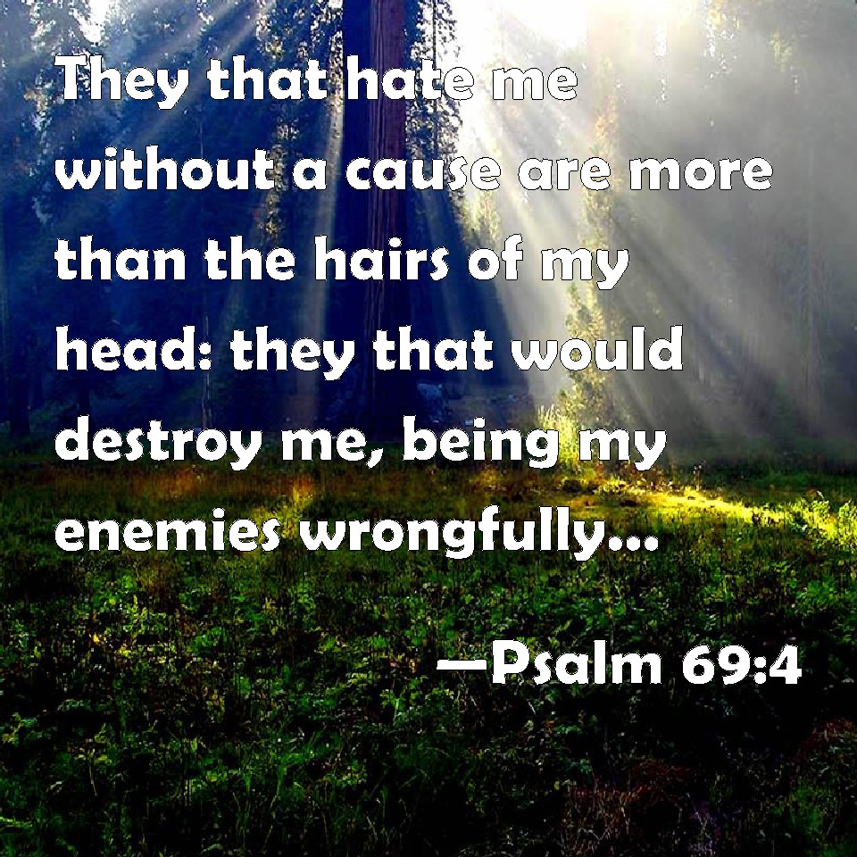 Choose a Background Psalm 69:4 They that hate me without a cause are more than the hairs of my head: they that would destroy me, being my enemies wrongfully, are mighty: then I restored that which I took not away. KJV: They that hate me without a cause are more than the hairs of mine head: they that would destroy me, being mine enemies wrongfully, are mighty: then I restored that which I took not away. DRB: They are multiplied above the hairs of my head, who hate me without cause. My enemies are grown strong who have wrongfully persecuted me: then did I pay that which I took not away. DBT: They that hate me without a cause are more than the hairs of my head; they that would destroy me, being mine enemies wrongfully, are mighty: then I restored that which I took not away. ERV: They that hate me without a cause are more than the hairs of mine head: they that would cut me off, being mine enemies wrongfully, are mighty: then I restored that which I took not away. WBT: They that hate me without a cause are more than the hairs of my head: they that would destroy me, being my enemies wrongfully, are mighty: then I restored that which I took not away. WEB: Those who hate me without a cause are more than the hairs of my head. Those who want to cut me off, being my enemies wrongfully, are mighty. I have to restore what I didn't take away. YLT: Those hating me without cause Have been more than the hairs of my head, Mighty have been my destroyers, My lying enemies, That which I took not away — I bring back.Links Psalm 69:4 NIV • Psalm 69:4 NLT • Psalm 69:4 ESV • Psalm 69:4 NASB • Psalm 69:4 KJV • Psalm 69:4 Interlinear • Psalm 69:4 Commentaries • Psalm 69:4 Parallel Texts • Psalm 69:4 Bible Apps • Psalm 69:4 Parallel • Bible Hub |