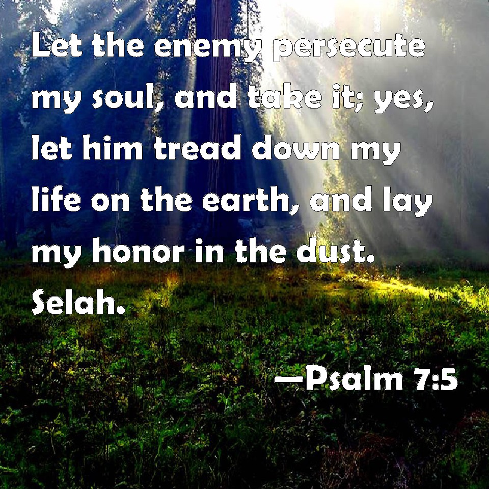 Choose a Background Psalm 7:5 Let the enemy persecute my soul, and take it; yes, let him tread down my life on the earth, and lay my honor in the dust. Selah. KJV: Let the enemy persecute my soul, and take it; yea, let him tread down my life upon the earth, and lay mine honour in the dust. Selah. DRB: Let the enemy pursue my soul, and take it, and tread down my life on the earth, and bring down my glory to the dust. DBT: Let the enemy pursue after my soul, and take it, and let him tread down my life to the earth, and lay my glory in the dust. Selah. ERV: Let the enemy pursue my soul, and overtake it; yea, let him tread my life down to the earth, and lay my glory in the dust. Selah WBT: Let the enemy persecute my soul, and take it; yes, let him tread down my life upon the earth, and lay my honor in the dust. Selah. WEB: let the enemy pursue my soul, and overtake it; yes, let him tread my life down to the earth, and lay my glory in the dust. Selah. YLT: An enemy pursueth my soul, and overtaketh, And treadeth down to the earth my life, And my honour placeth in the dust. Selah.Links Psalm 7:5 NIV • Psalm 7:5 NLT • Psalm 7:5 ESV • Psalm 7:5 NASB • Psalm 7:5 KJV • Psalm 7:5 Interlinear • Psalm 7:5 Commentaries • Psalm 7:5 Parallel Texts • Psalm 7:5 Bible Apps • Psalm 7:5 Parallel • Bible Hub |
