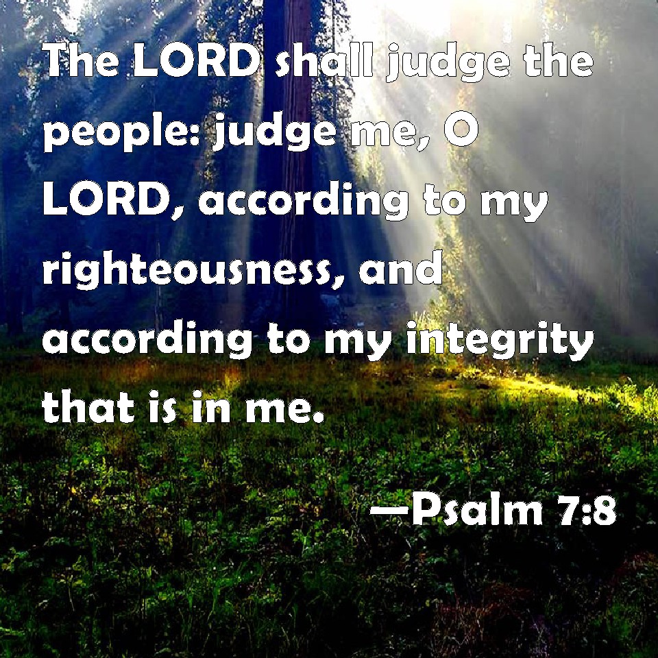 Choose a Background Psalm 7:8 The LORD shall judge the people: judge me, O LORD, according to my righteousness, and according to my integrity that is in me. KJV: The LORD shall judge the people: judge me, O LORD, according to my righteousness, and according to mine integrity that is in me. DRB: The Lord judgeth the people. Judge me, O Lord, according to my justice, and according to my innocence in me. DBT: Jehovah shall minister judgment to the peoples. Judge me, Jehovah, according to my righteousness, and according to mine integrity which is in me. ERV: The LORD ministereth judgment to the peoples: judge me, O LORD, according to my righteousness, and to mine integrity that is in me. WBT: The LORD shall judge the people: judge me, O LORD, according to my righteousness, and according to my integrity that is in me. WEB: Yahweh administers judgment to the peoples. Judge me, Yahweh, according to my righteousness, and to my integrity that is in me. YLT: Jehovah doth judge the peoples; Judge me, O Jehovah, According to my righteousness, And according to mine integrity on me,Links Psalm 7:8 NIV • Psalm 7:8 NLT • Psalm 7:8 ESV • Psalm 7:8 NASB • Psalm 7:8 KJV • Psalm 7:8 Interlinear • Psalm 7:8 Commentaries • Psalm 7:8 Parallel Texts • Psalm 7:8 Bible Apps • Psalm 7:8 Parallel • Bible Hub |