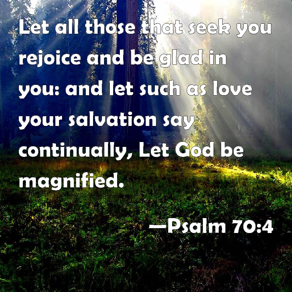 Psalm 70:4 Let all those that seek you rejoice and be glad in you: and let such as love your salvation say continually, Let God be magnified.