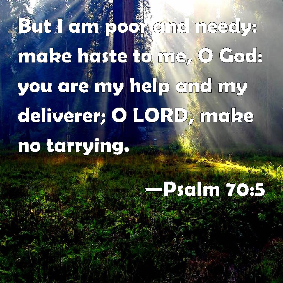 Choose a Background Psalm 70:5 But I am poor and needy: make haste to me, O God: you are my help and my deliverer; O LORD, make no tarrying. KJV: But I am poor and needy: make haste unto me, O God: thou art my help and my deliverer; O LORD, make no tarrying. DRB: But I am needy and poor; O God, help me. Thou art my helper and my deliverer: O Lord, make no delay. DBT: But I am afflicted and needy: make haste unto me, O God. Thou art my help and my deliverer: O Jehovah, make no delay. ERV: But I am poor and needy; make haste unto me, O God: thou art my help and my deliverer; O LORD, make no tarrying. WBT: But I am poor and needy: make haste to me, O God: thou art my help and my deliverer; O LORD, make no delay. WEB: But I am poor and needy. Come to me quickly, God. You are my help and my deliverer. Yahweh, don't delay. YLT: And I am poor and needy, O God, haste to me, My help and my deliverer art Thou, O Jehovah, tarry Thou not!Links Psalm 70:5 NIV • Psalm 70:5 NLT • Psalm 70:5 ESV • Psalm 70:5 NASB • Psalm 70:5 KJV • Psalm 70:5 Interlinear • Psalm 70:5 Commentaries • Psalm 70:5 Parallel Texts • Psalm 70:5 Bible Apps • Psalm 70:5 Parallel • Bible Hub |