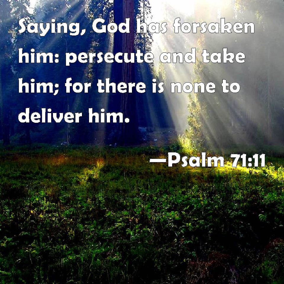 Choose a Background Psalm 71:11 Saying, God has forsaken him: persecute and take him; for there is none to deliver him. KJV: Saying, God hath forsaken him: persecute and take him; for there is none to deliver him. DRB: Saying: God hath forsaken him: pursue and take him, for there is none to deliver him. DBT: Saying, God hath forsaken him; pursue and seize him, for there is none to deliver. ERV: Saying, God hath forsaken him: pursue and take him; for there is none to deliver. WBT: Saying, God hath forsaken him: persecute and take him; for there is none to deliver him. WEB: saying, "God has forsaken him. Pursue and take him, for no one will rescue him." YLT: Saying, 'God hath forsaken him, Pursue and catch him, for there is no deliverer.'Links Psalm 71:11 NIV • Psalm 71:11 NLT • Psalm 71:11 ESV • Psalm 71:11 NASB • Psalm 71:11 KJV • Psalm 71:11 Interlinear • Psalm 71:11 Commentaries • Psalm 71:11 Parallel Texts • Psalm 71:11 Bible Apps • Psalm 71:11 Parallel • Bible Hub |
